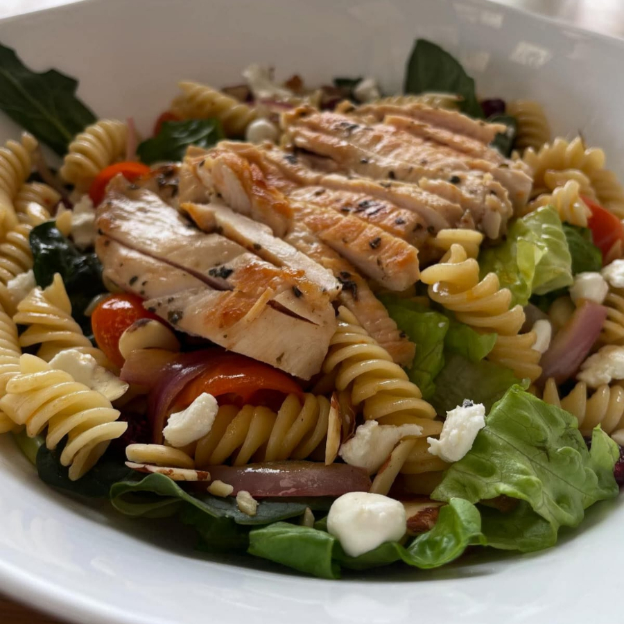 Ensalada con pollo a la plancha, exquisita con queso de cabra, almendra, arandanos, pasta fusilli, tomate cherry y cebolla salteada.