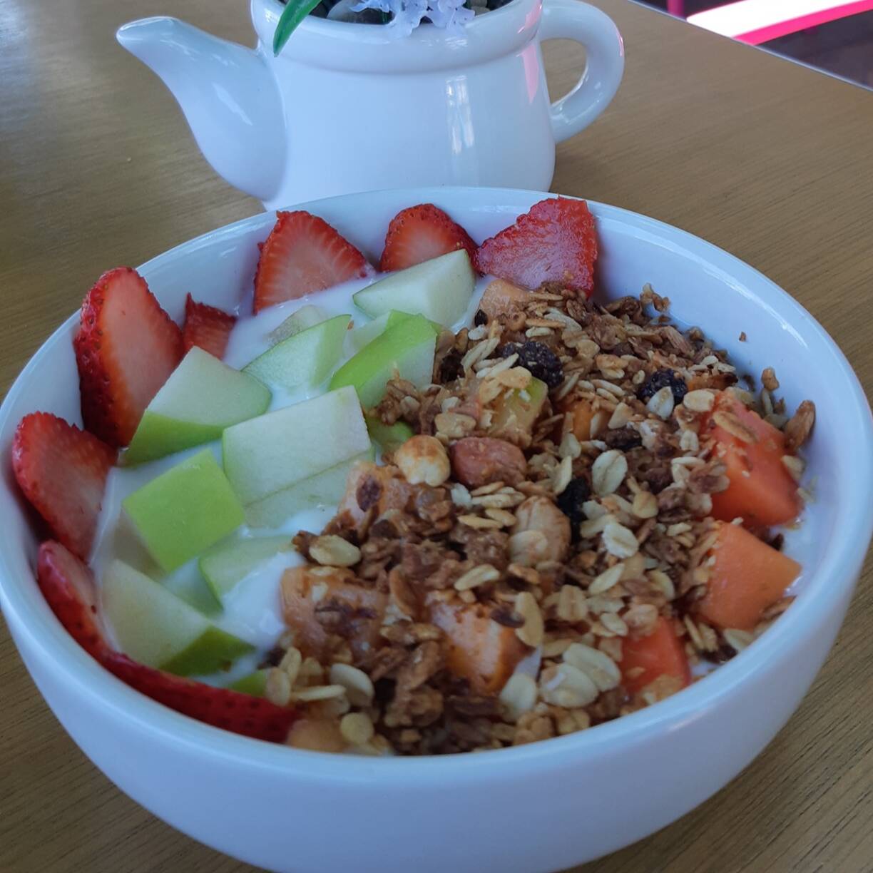 Fresa, Manzana, Melón, Papaya, granola y yoghurt natural