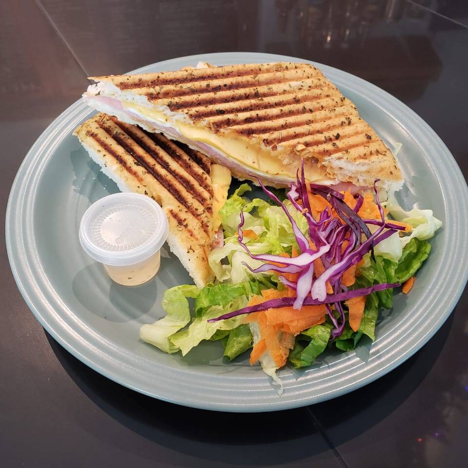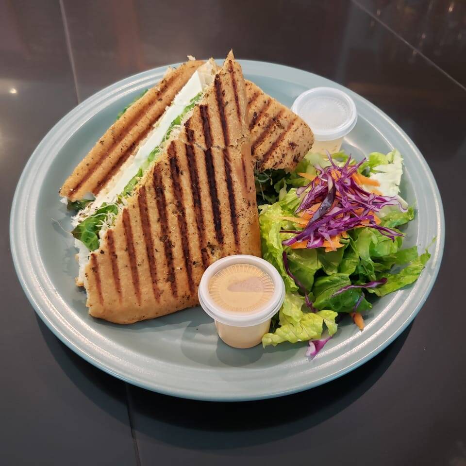 Pan focaccia, pollo horneado, tocinoqueso gouda y ensalada.