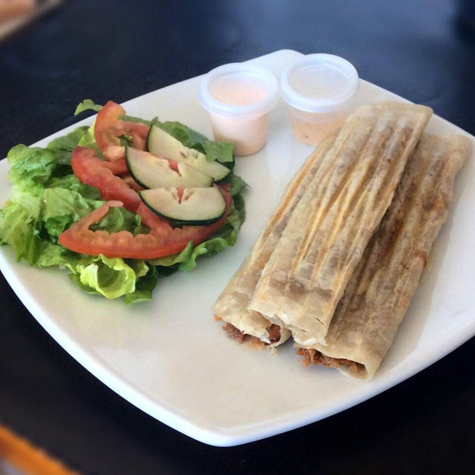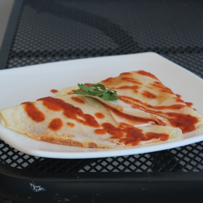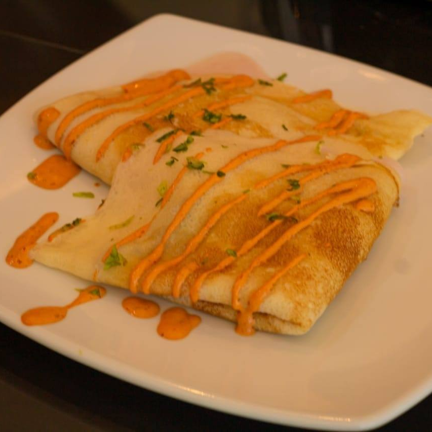 Exquisita crepa rellena con salsa marinada y especias, pepperoni, jamón de pavo y queso gouda, rallada en salsa de la casa de chipotle, espolvoreada con queso parmesano.