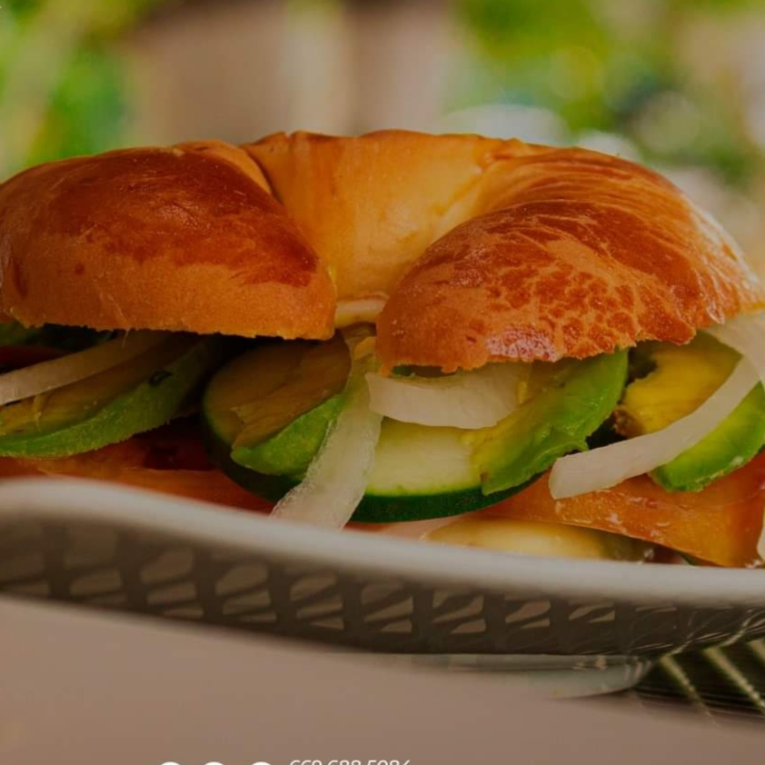 Pechuga de jamón de pavo, queso gouda, tomate, lechuga, aguacate y cebolla.