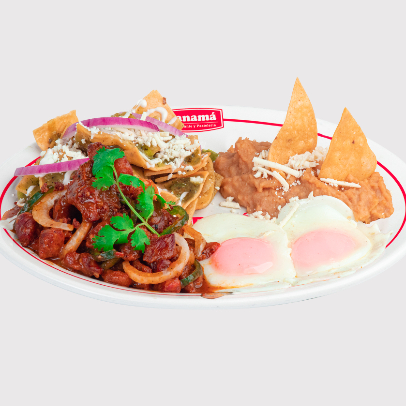 Rico platillo compuesto de chilaquiles rojos al chipotle y chilaquiles verdes a la crema, con cubos de pollo asado (70 g) y frijolitos.