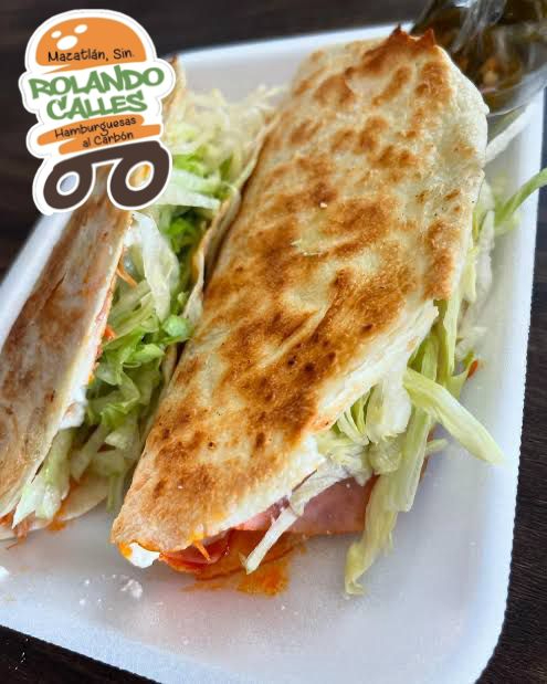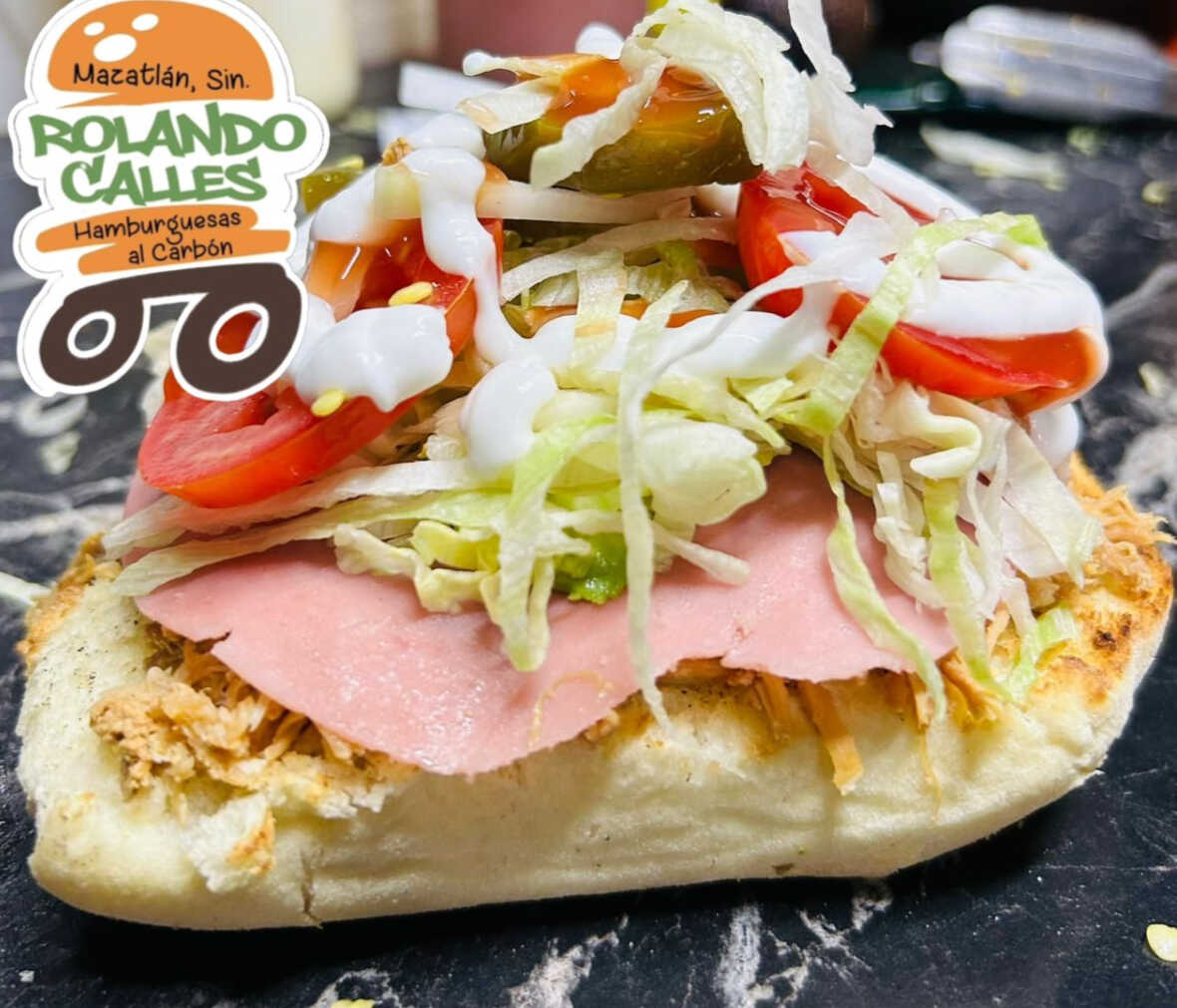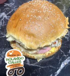 Pan artesanal, carne de res 100 % casera asada al carbón, jamón, queso americano, salchicha de hot dog asada, aguacate, lechuga, tomate, cebolla blanca, cátsup, mostaza y mayonesa.