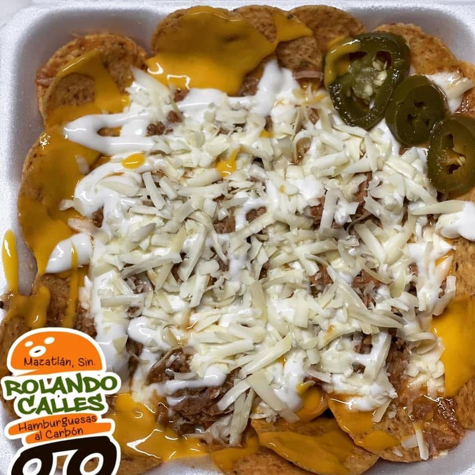 Totopo de maíz, queso de nacho, pechuga de pollo asada, crema y queso chihuahua.