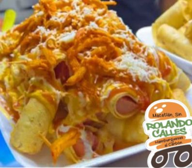 Salchicha de hot dog envuelta en tortilla, bañada con aderezo de queso de nachos, pierna de puerco, queso chihuahua y crema.