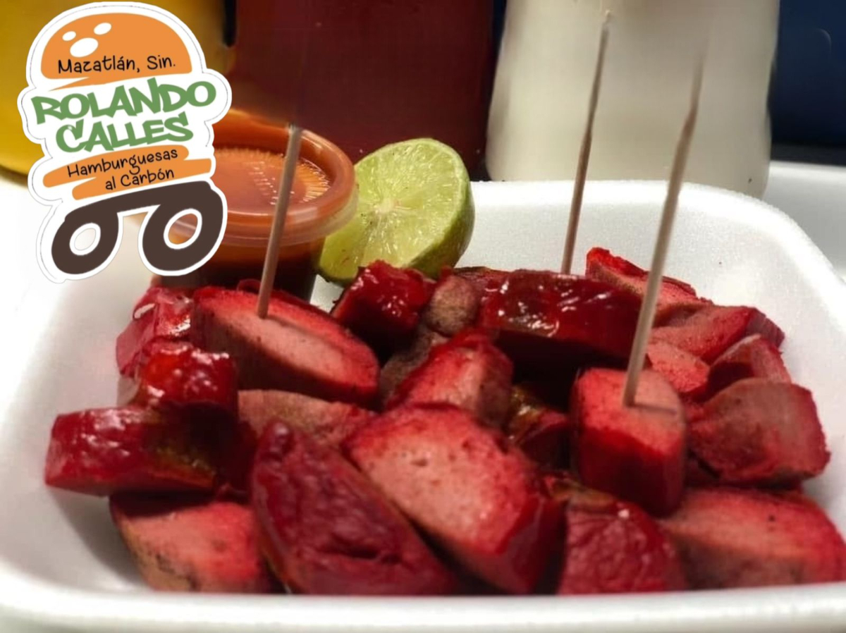 Salchicha roja asada al carbón partida en trozo acompañada de salsa y limón.