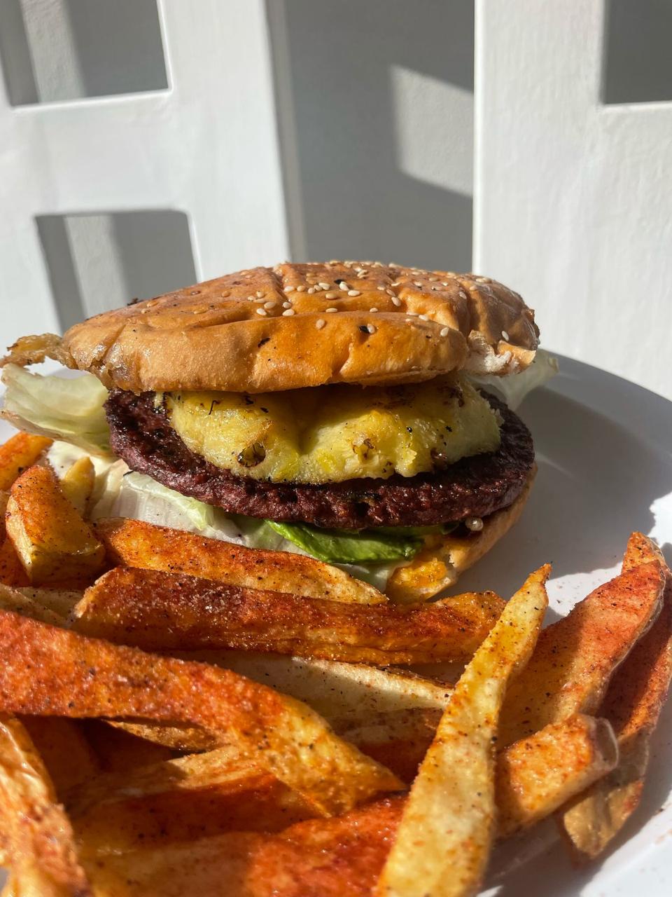 Pan, Queso Chihuahua, Queso Amarillo, Piña Asada, Carne, Lechuga, Tomate, Cebolla, Aguacate, Tocino, Crema mostaza mayonesa catsup y aderezo de la casa