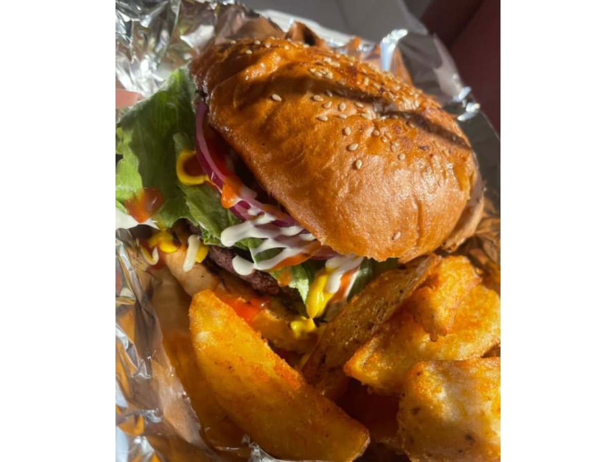 Pan de ajonjolí con carne de fe hamburguesa tocino champiñones salteados en un aderezó especial de la casa con cebolla frita y bañada en queso Chihuahua y queso amarillo lechuga tomate y cebolla crema mayonesa capsu y moztaza