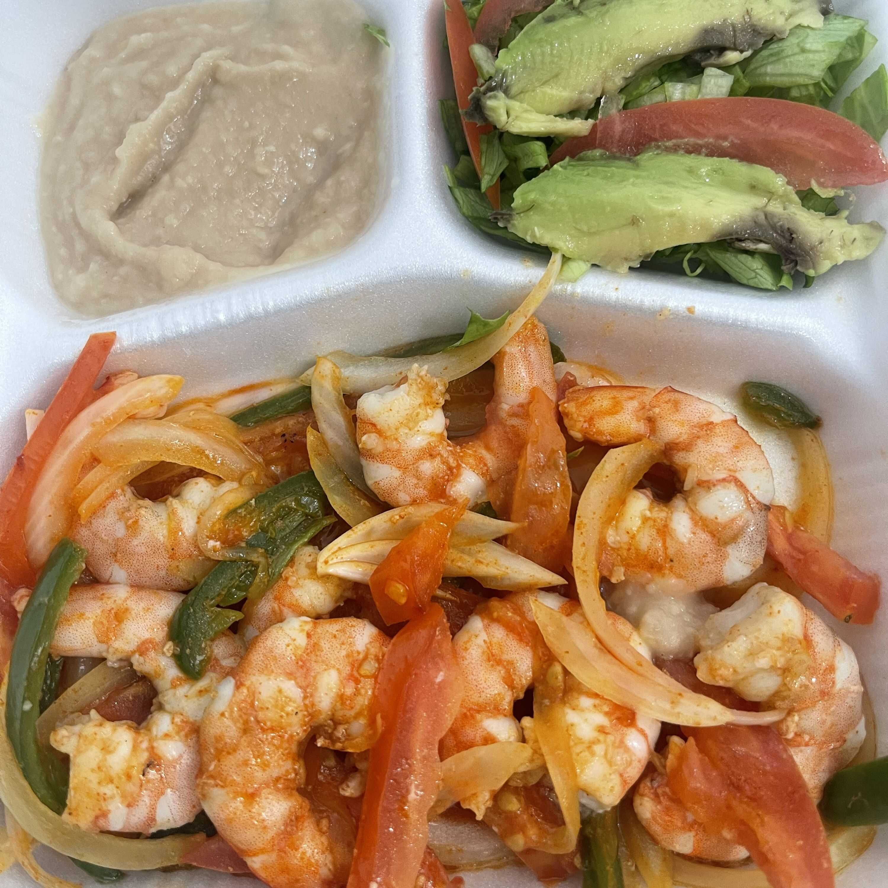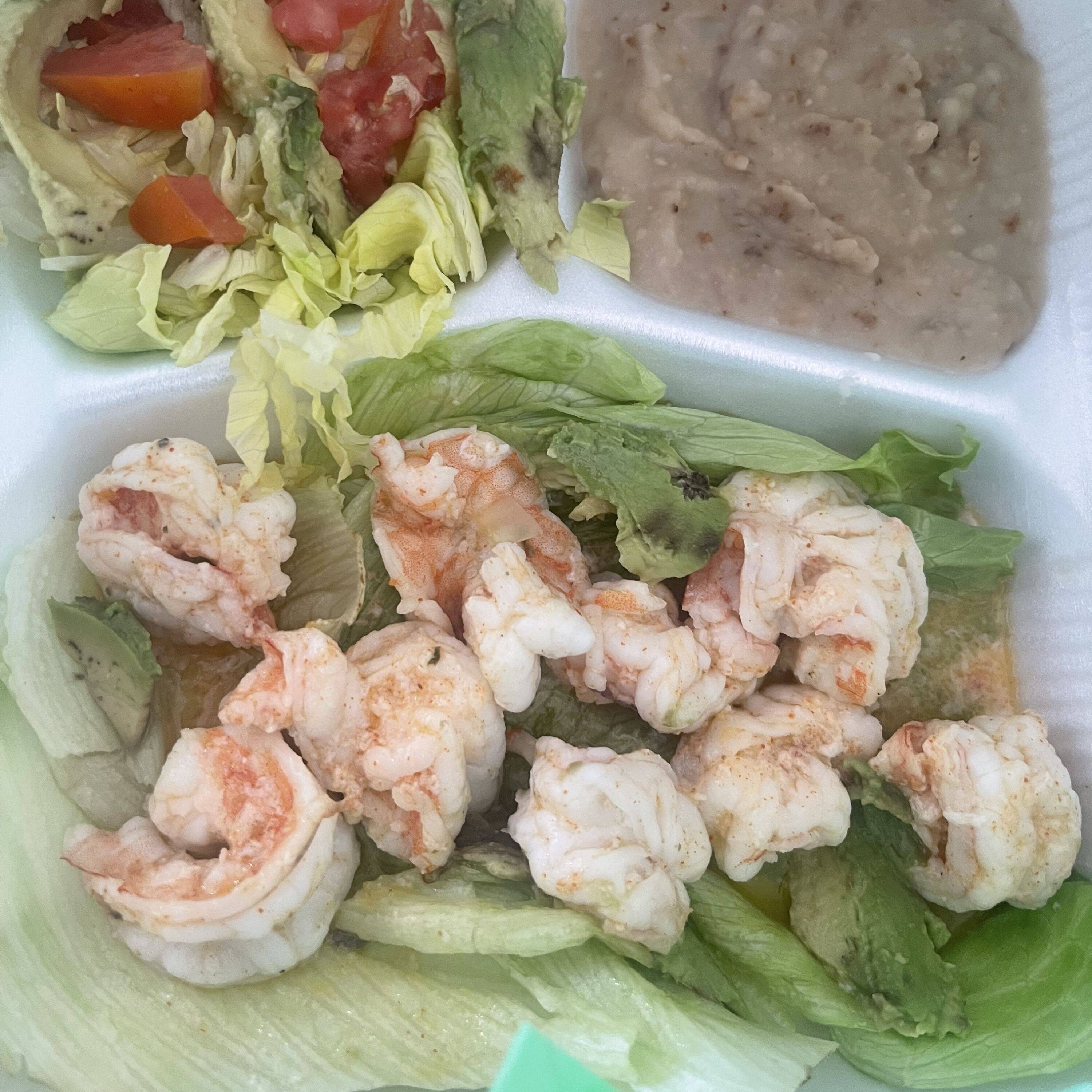 Camarones sazonados ,rajas de jalapeño,tomate y cebolla, acompañados de ensalada y frijoles, incluye tortillas y salsa