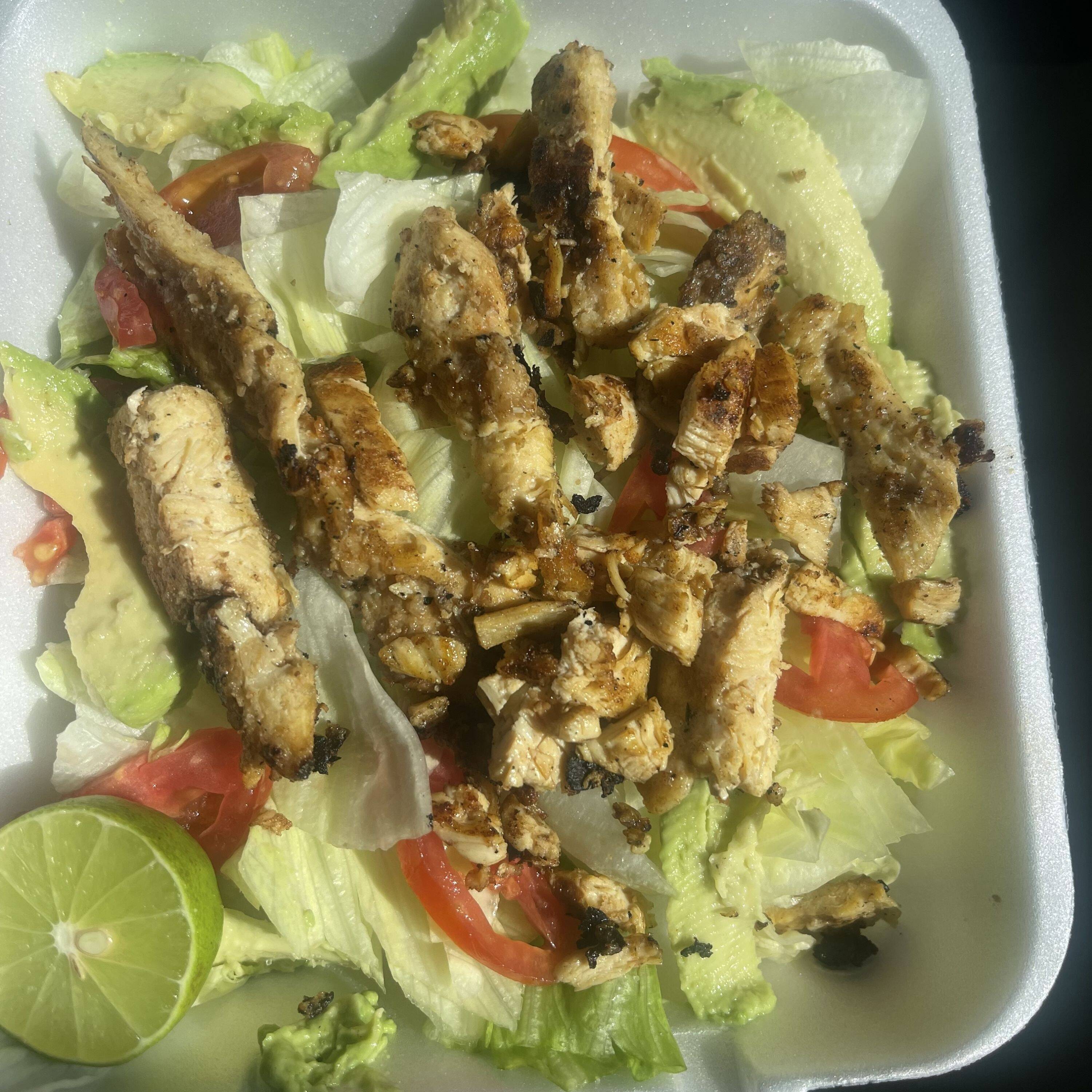 Lechuga,tomate,pepino,aguacate,pechuga de pollo a la plancha con marinado de la casa