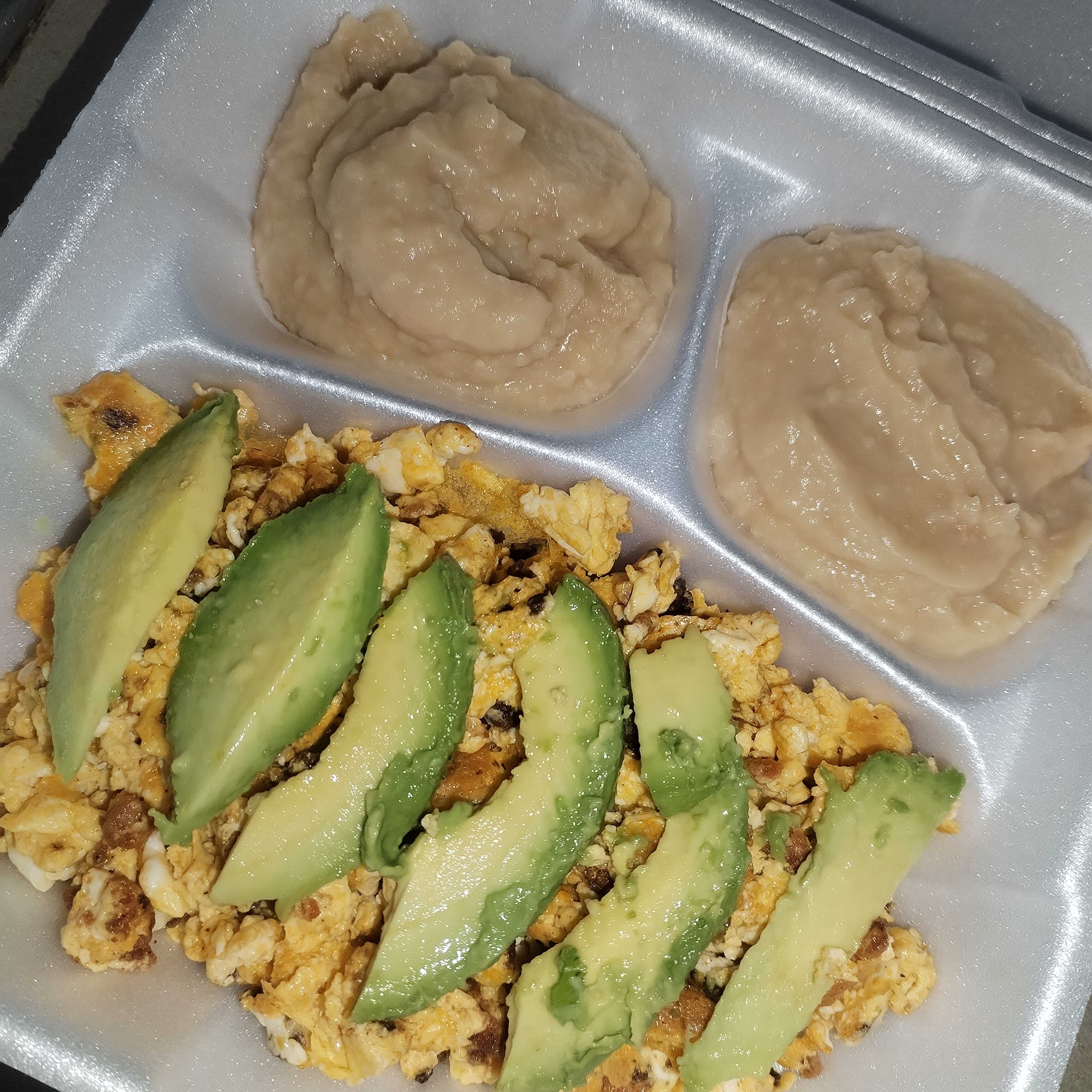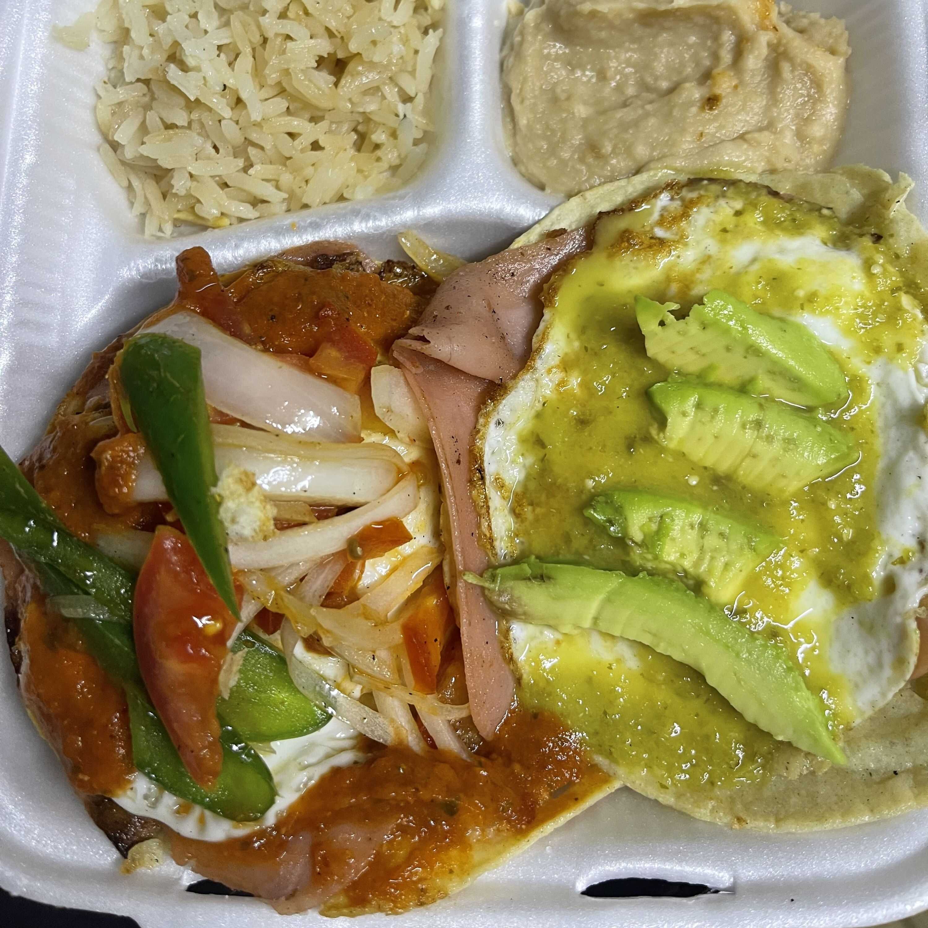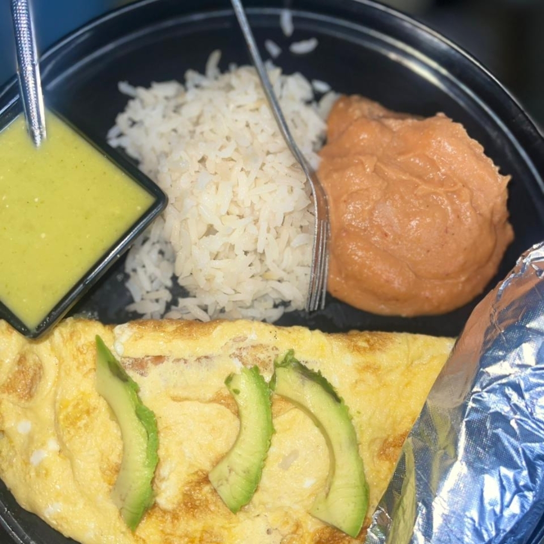 Tortilla 2 huevos uno con aguacate y salsa verdad otro con jalapeño,tomate y cebolla en salsa roja, acompañado de ensalada y frijoles,incluye tortillas