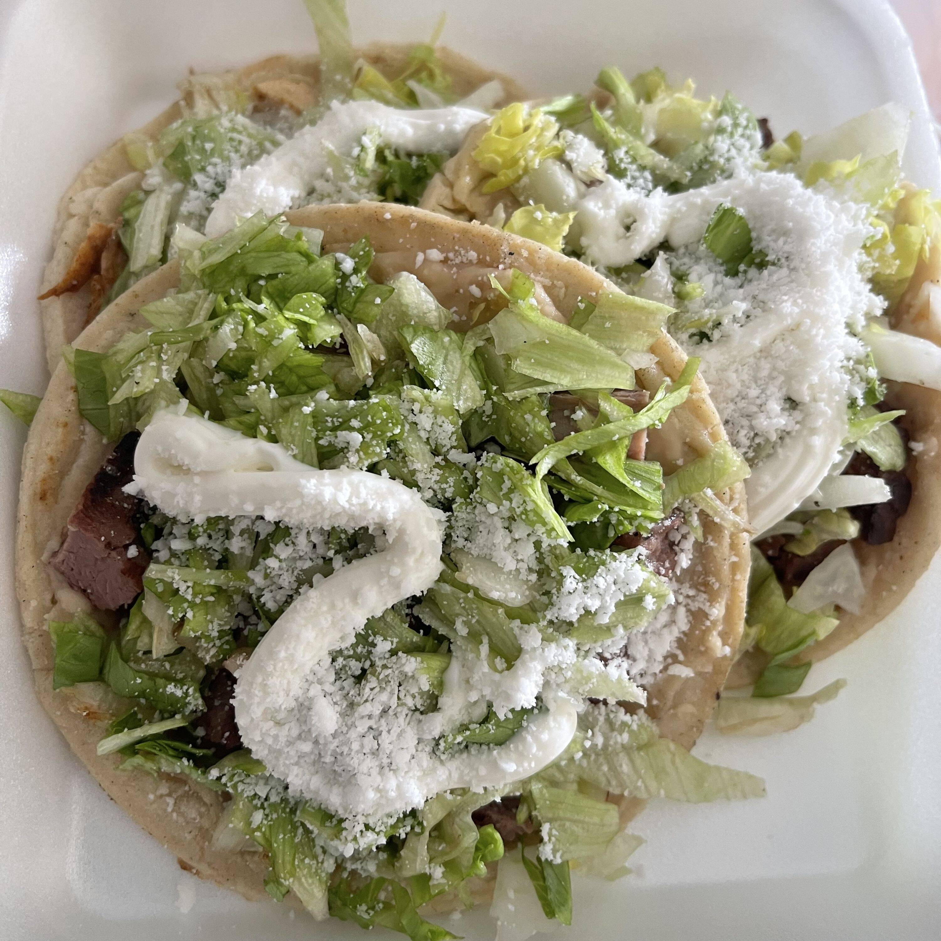 3 piezas,Guiso a elegir,(pierna, choriqueso,picadillo,arrachera,rajas),base de frijoles,guiso,lechuga,crema y queso seco