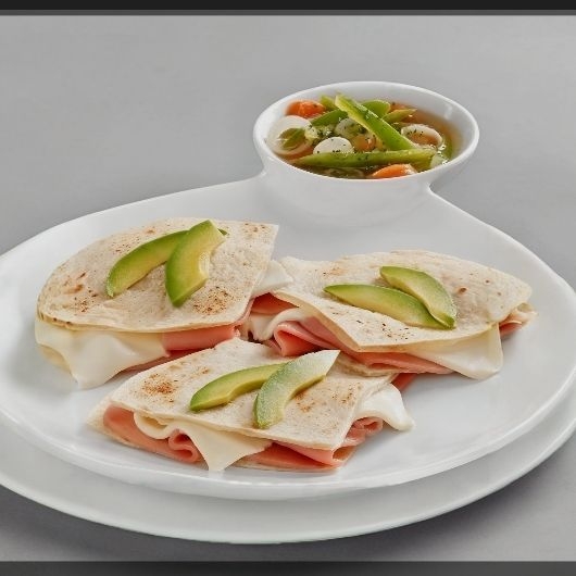 Tortilla de harina,jamón,queso Chihuahua y aguacate acompañadas de ensalada y frijoles