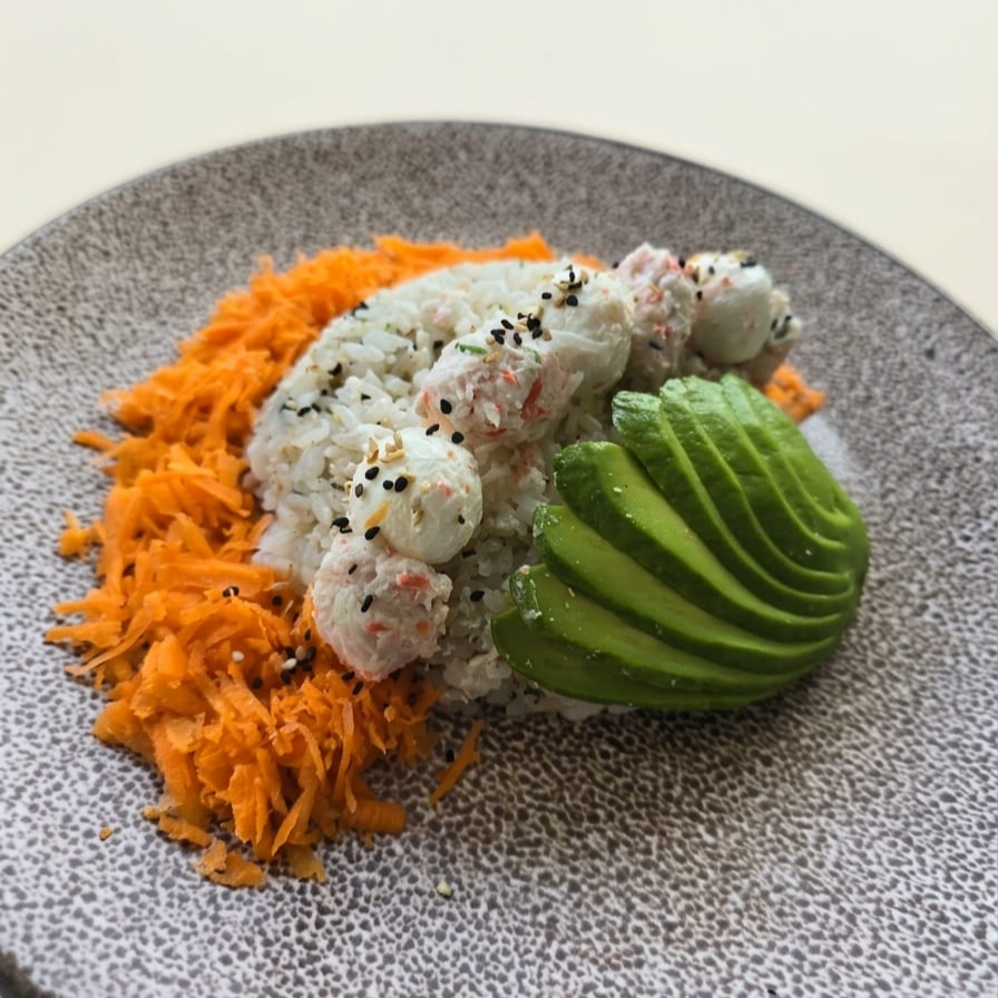 Arroz blanco acompañado con furikake, Philadelphia, aguacate y tampico.