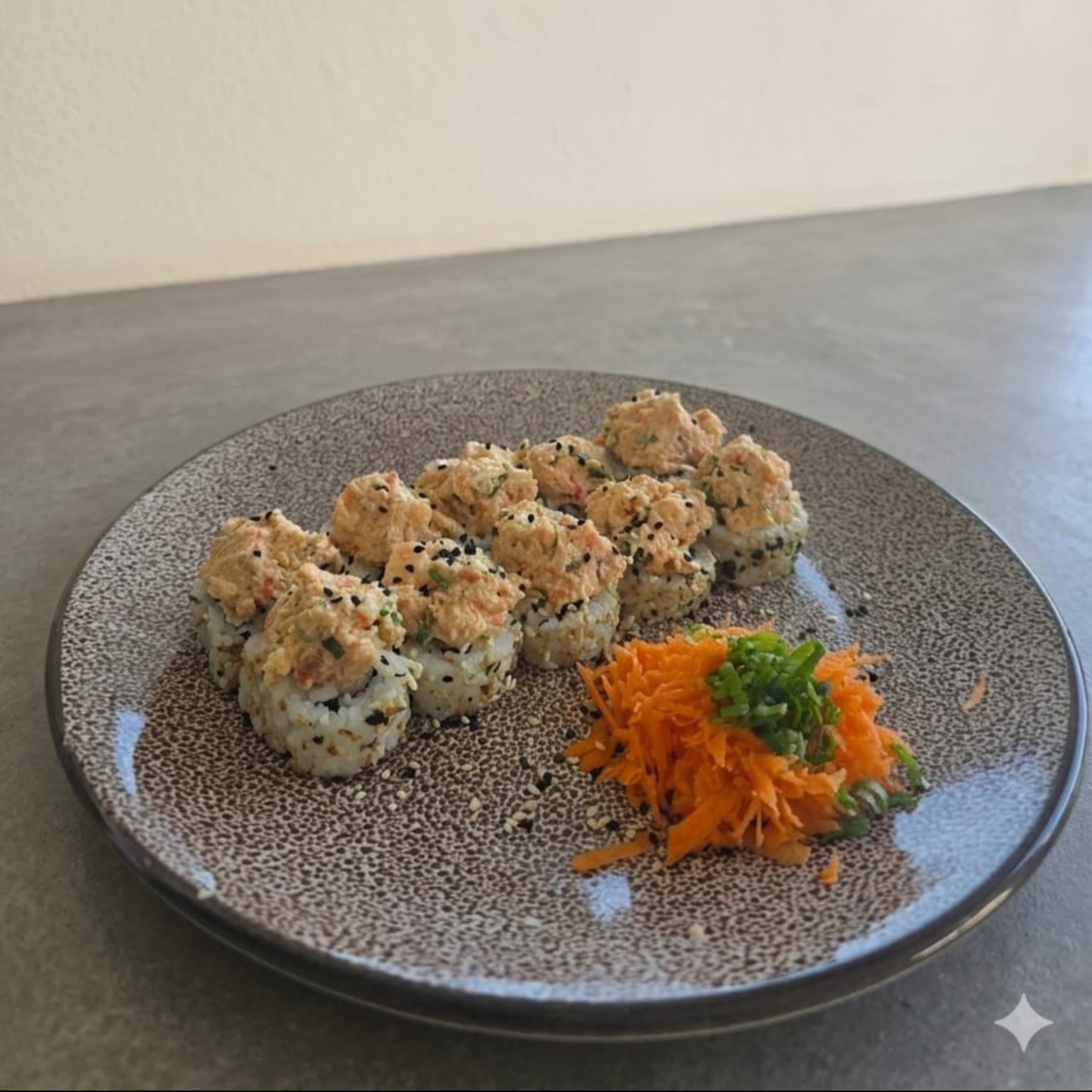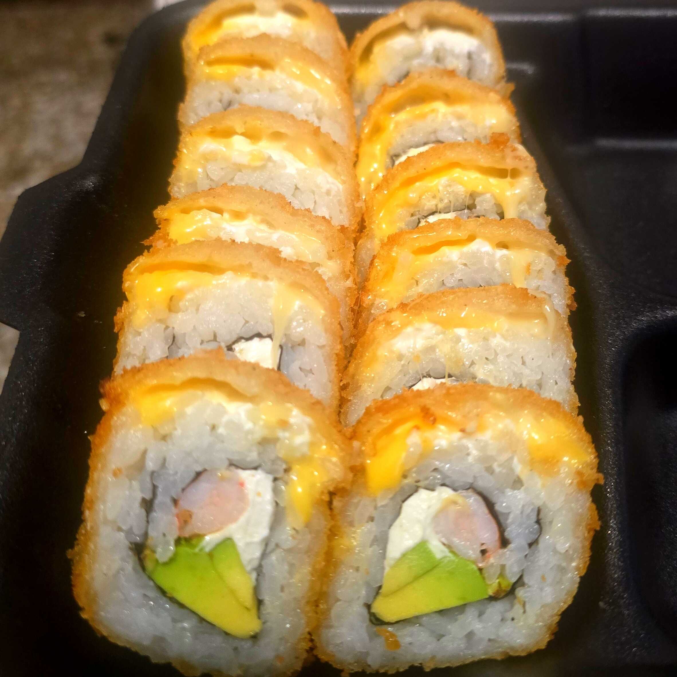 Relleno en Philadelphia aguacate, pepino y camarón capeado forrado en furikake. Topping de camarón con tampico spicy.