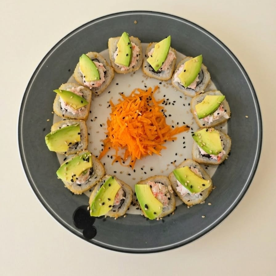 Relleno en Philadelphia aguacate, pepino camarón y surimi, con tapico y aguacate por encima.