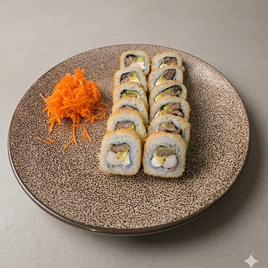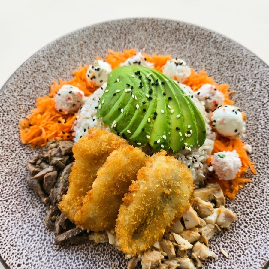 Arroz blanco con furikake, aguacate, Philadelphia, tampico, res y camarón empanizado.