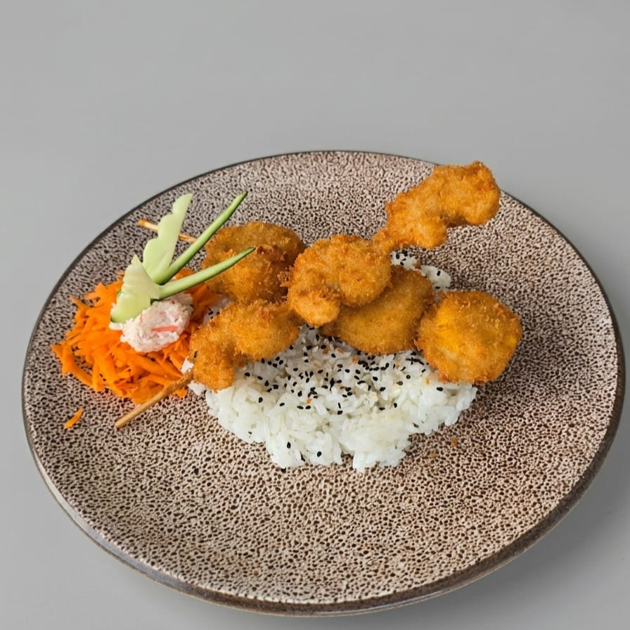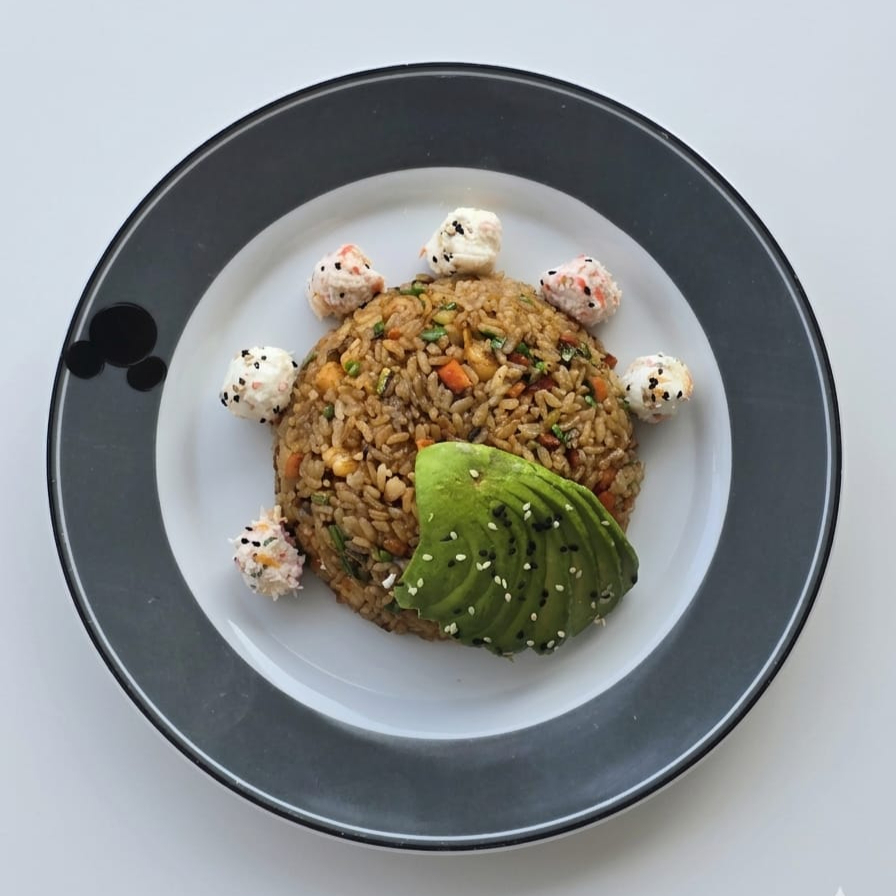 Arroz frito con zanahoria, calabaza, cebollín. Servido con tampico, Philadelphia, aguacate y camarón empanizado. Proteína a elegir.
