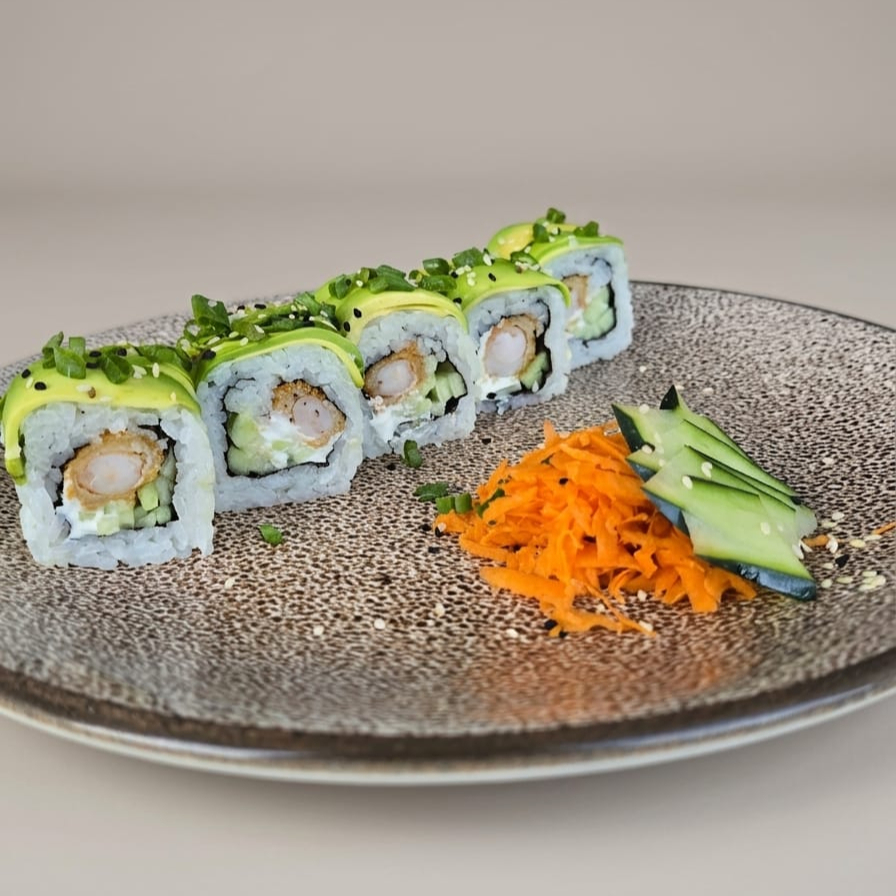 Relleno en Philadelphia, pepino, camarón empanizado. Forrado en aguacate.