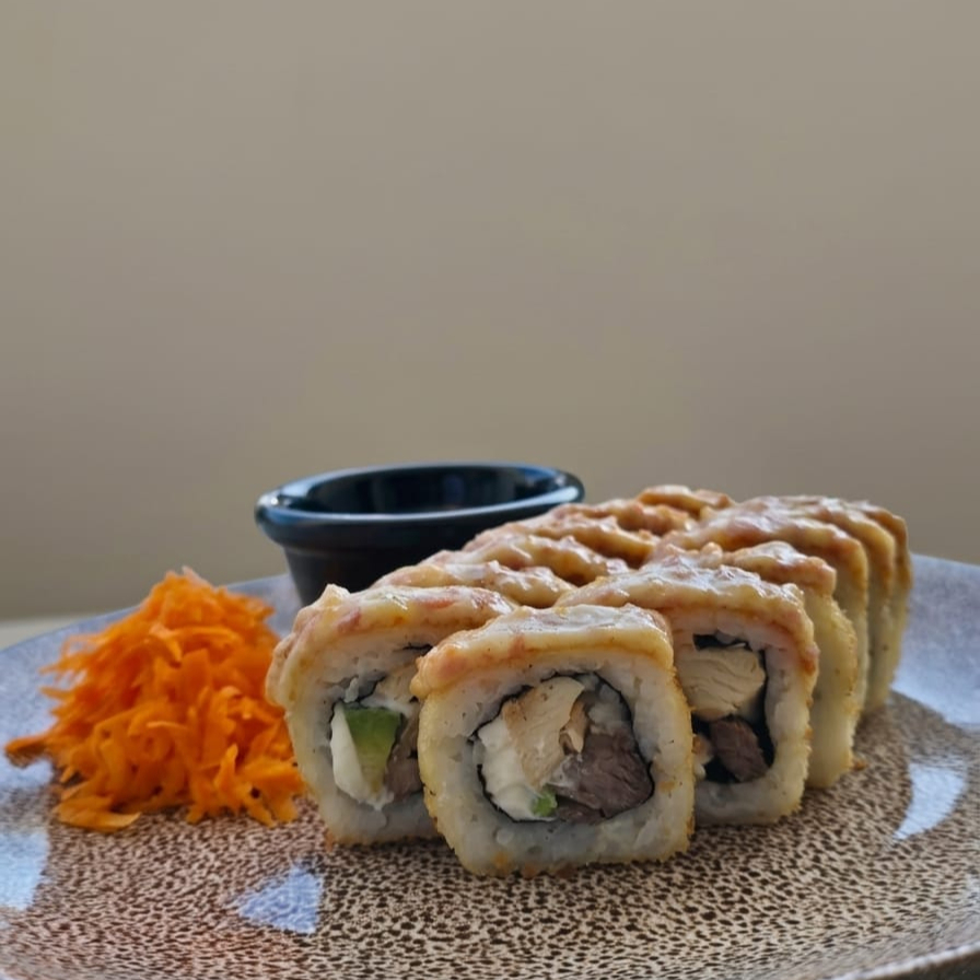 Relleno en philadelfia, aguacate, res y pollo, gratinado con tocino.