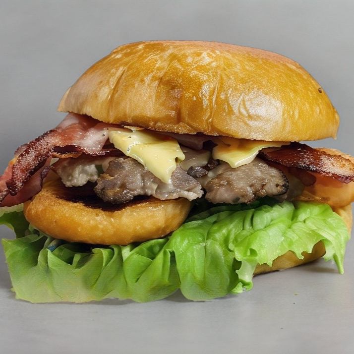 Doble carne de res sirlon,cebolla asada, 2 tiras de tocino, queso americano, lechuga, tomate, cebolla morada y aderezo de la casa.