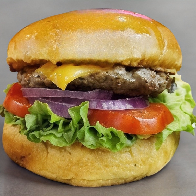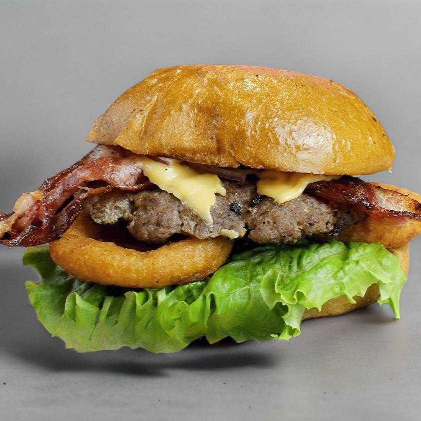 Nuestra deliciosa mezcla de carnes seleccionadas, queso americano, aros de cebolla, tocino y aderezo de la casa.