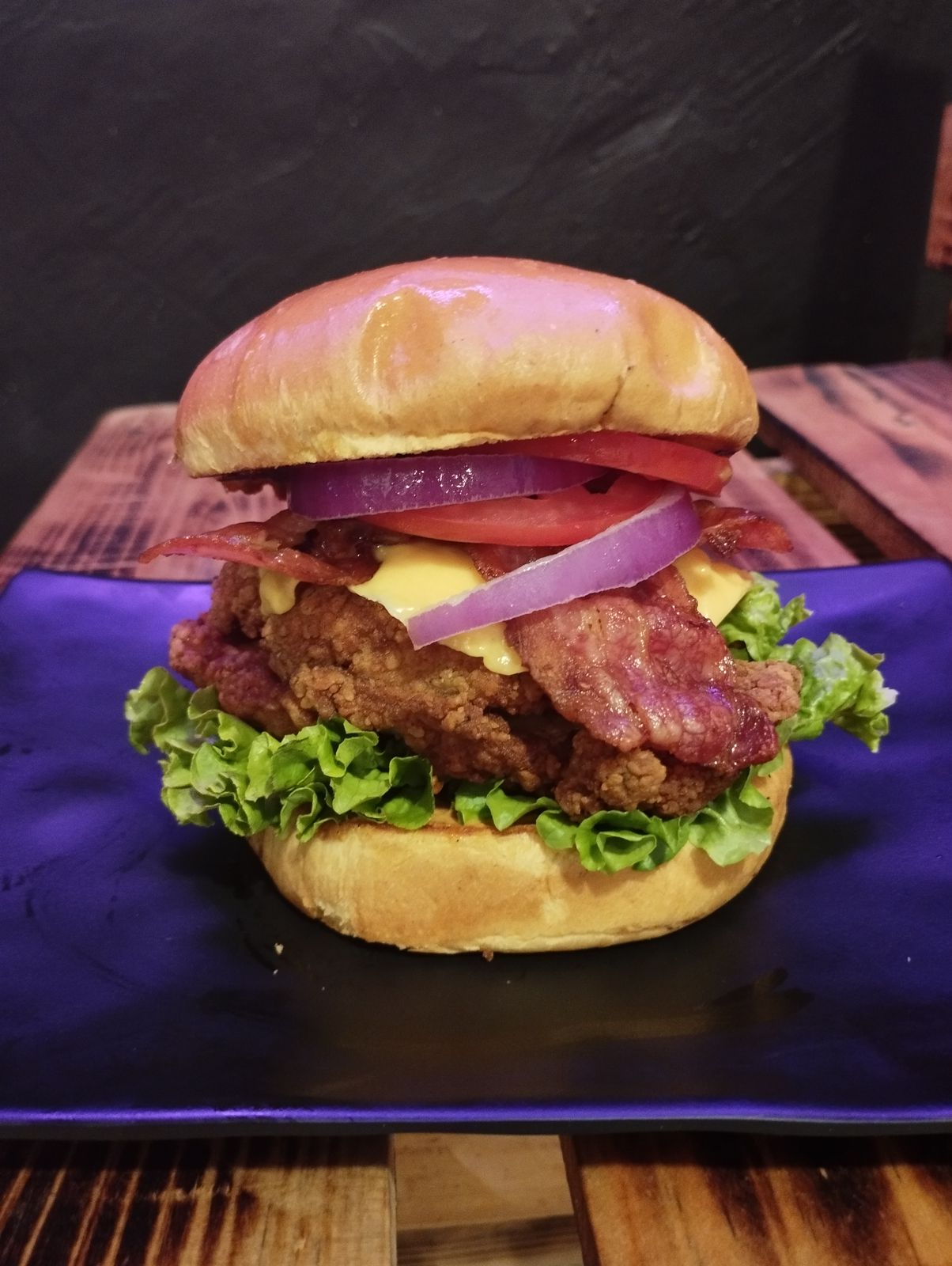 Crujiente pechuga de pollo, queso americano, tocino, lechuga, tomate, cebolla morada y aderezo de la casa.