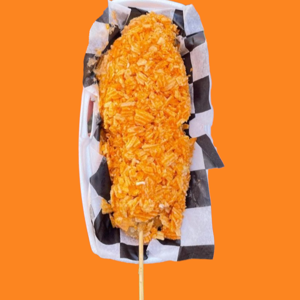 Banderilla cubierta de masa de la casa empanizada con papas naturales