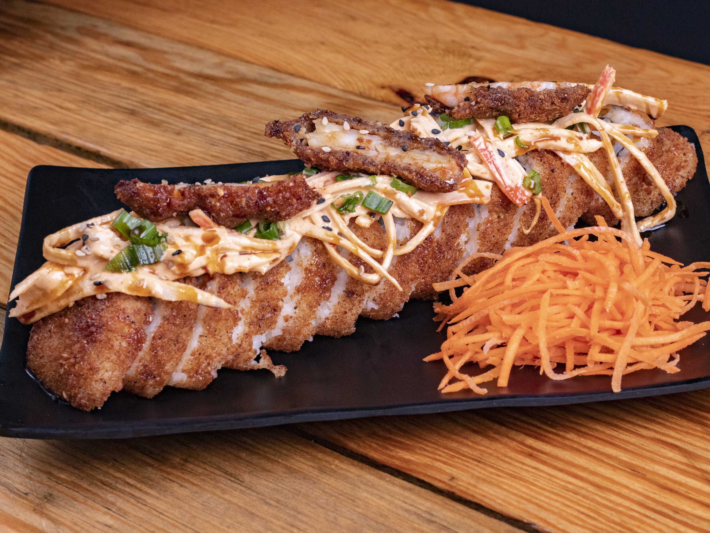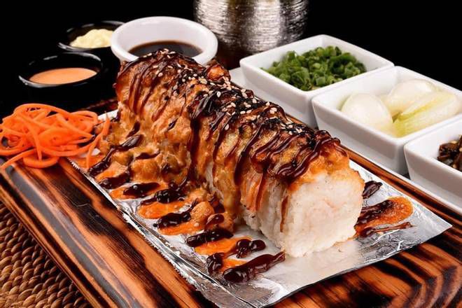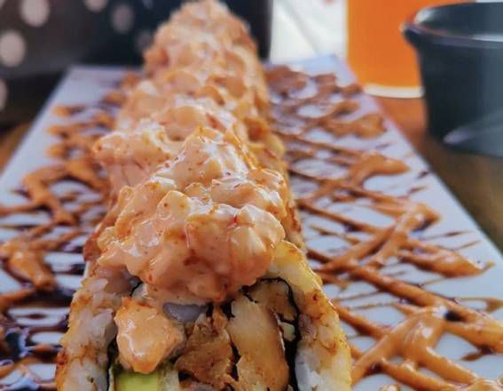 Rollo empanizado con philadelphia, pepino, aguacate, pollo y tocino por dentro. Por fuera topping de camarón bañado en salsa de anguila.