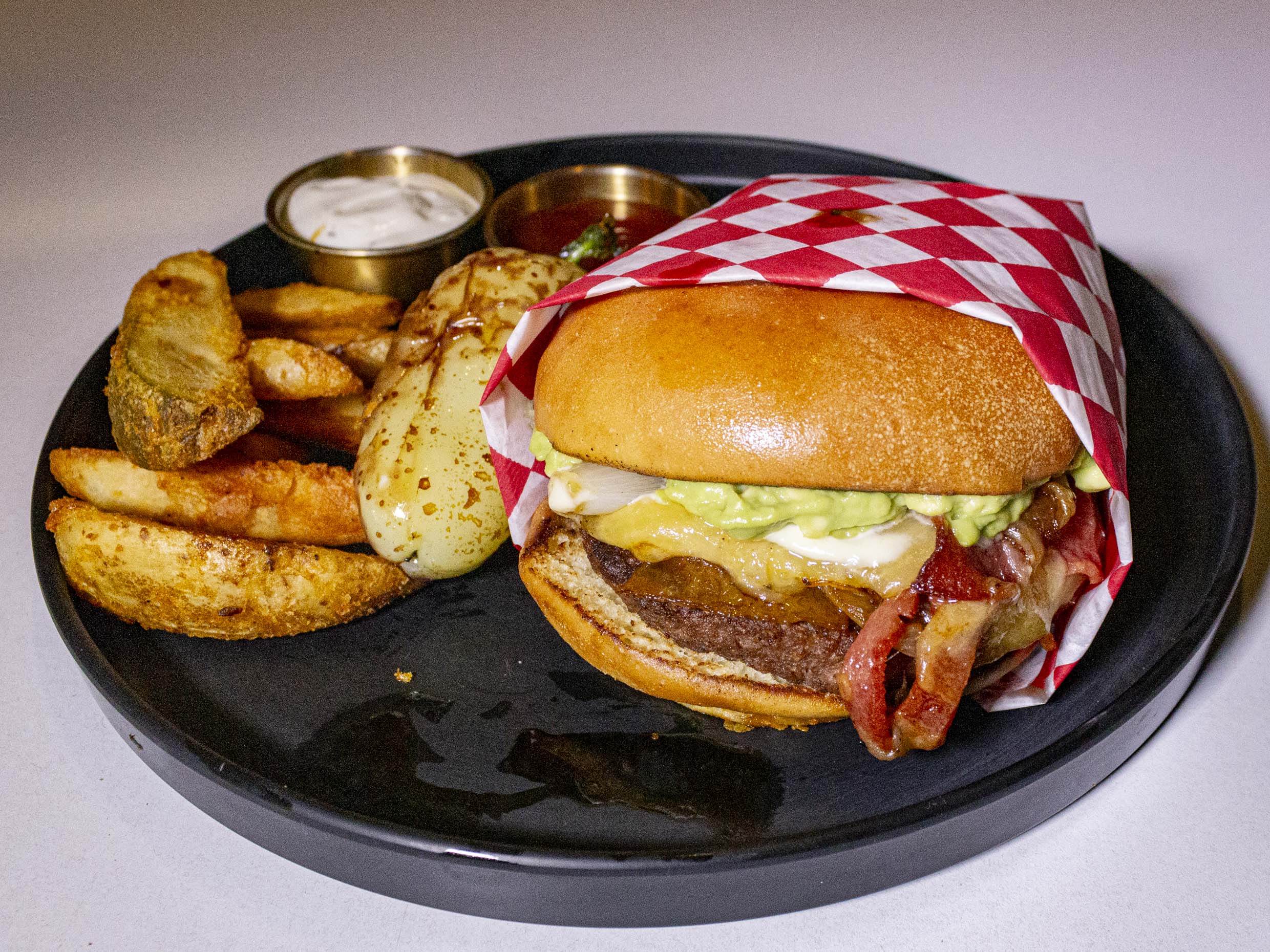 pan brioche, doble carne sirloin, doble queso americano, chihuahua, aguacate, cebolla asada y papas a elegir