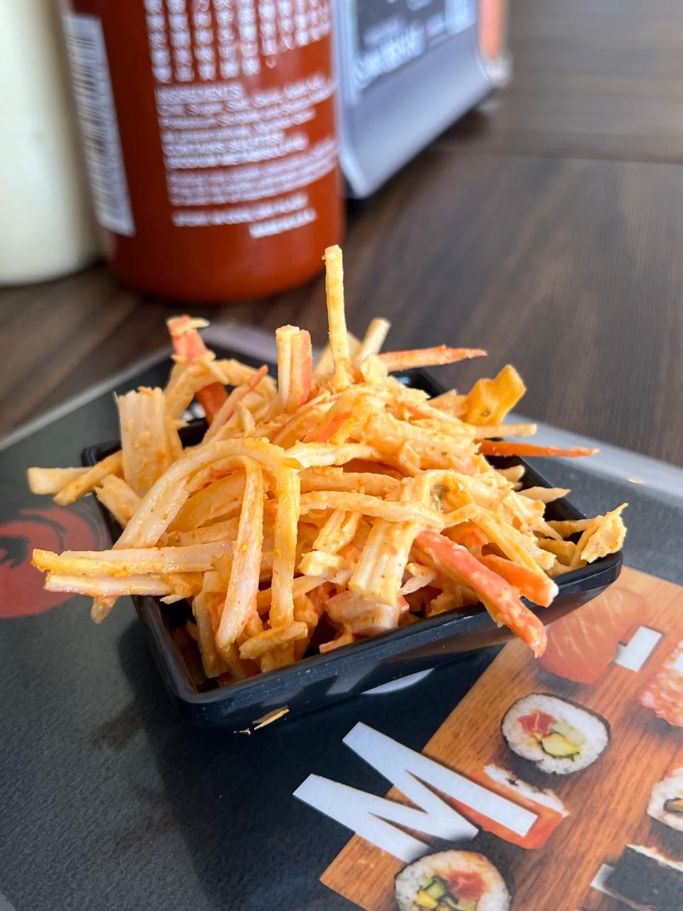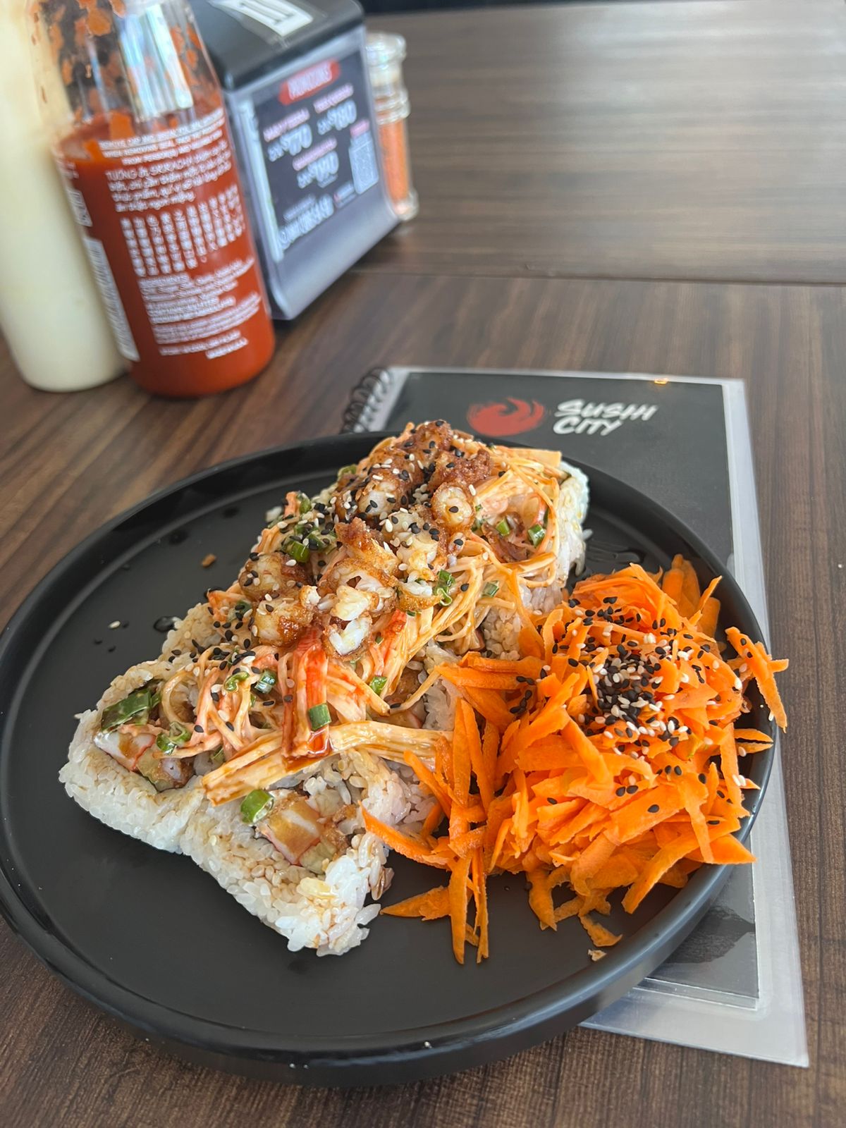 cama spicy, camaron,pulpo y kanikama, aguacate, ajonjoli en salsa especial city