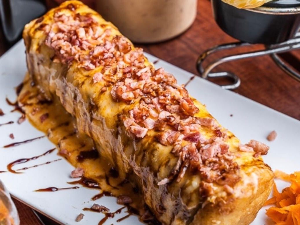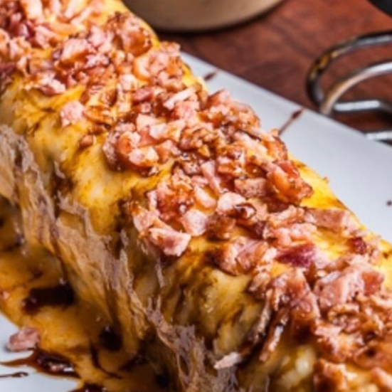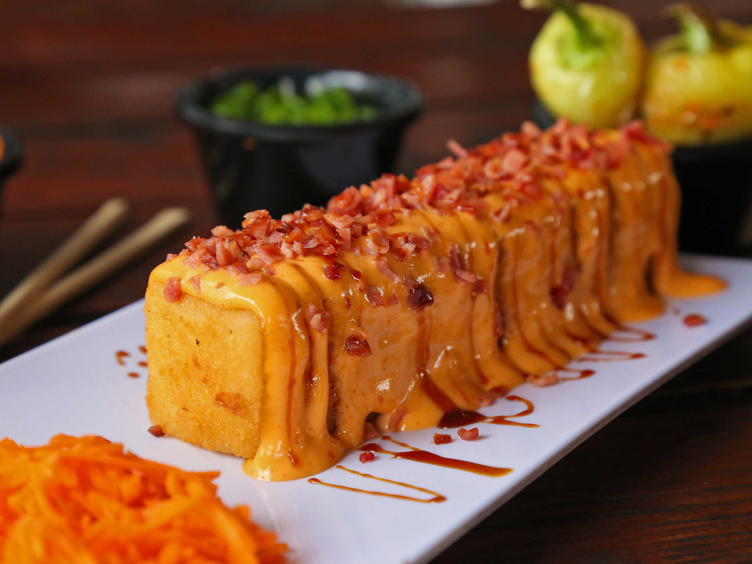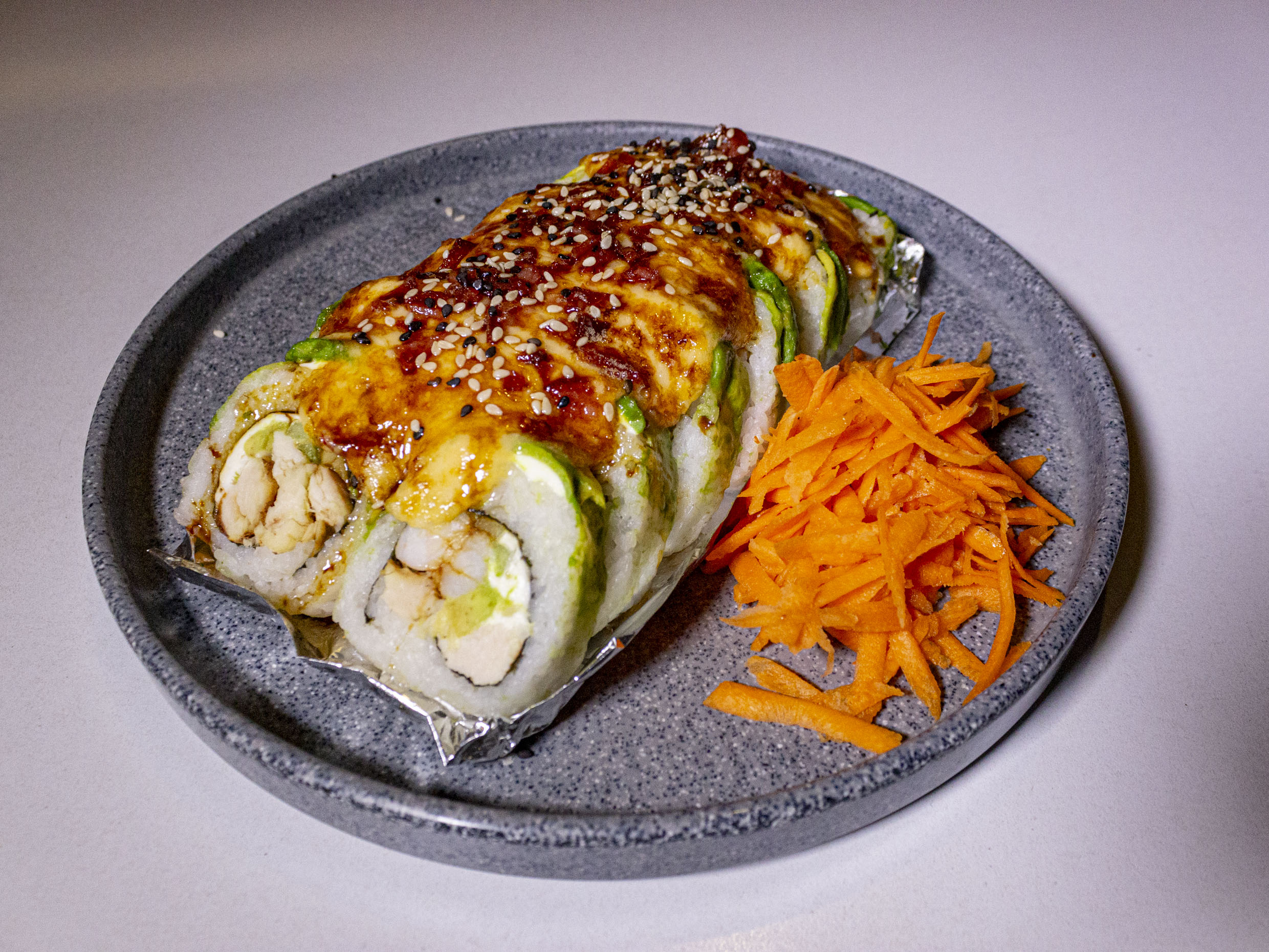 Phila, pepino, aguacate, cangrejo y camarón por dentro. Por fuera gratinado con trozos de tocino y toque salsa de anguila.