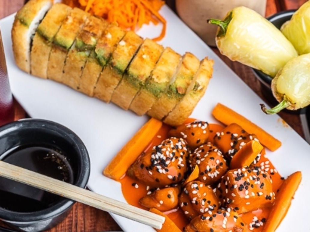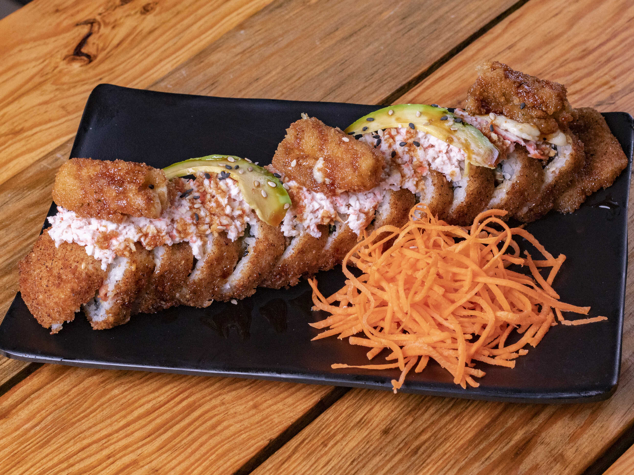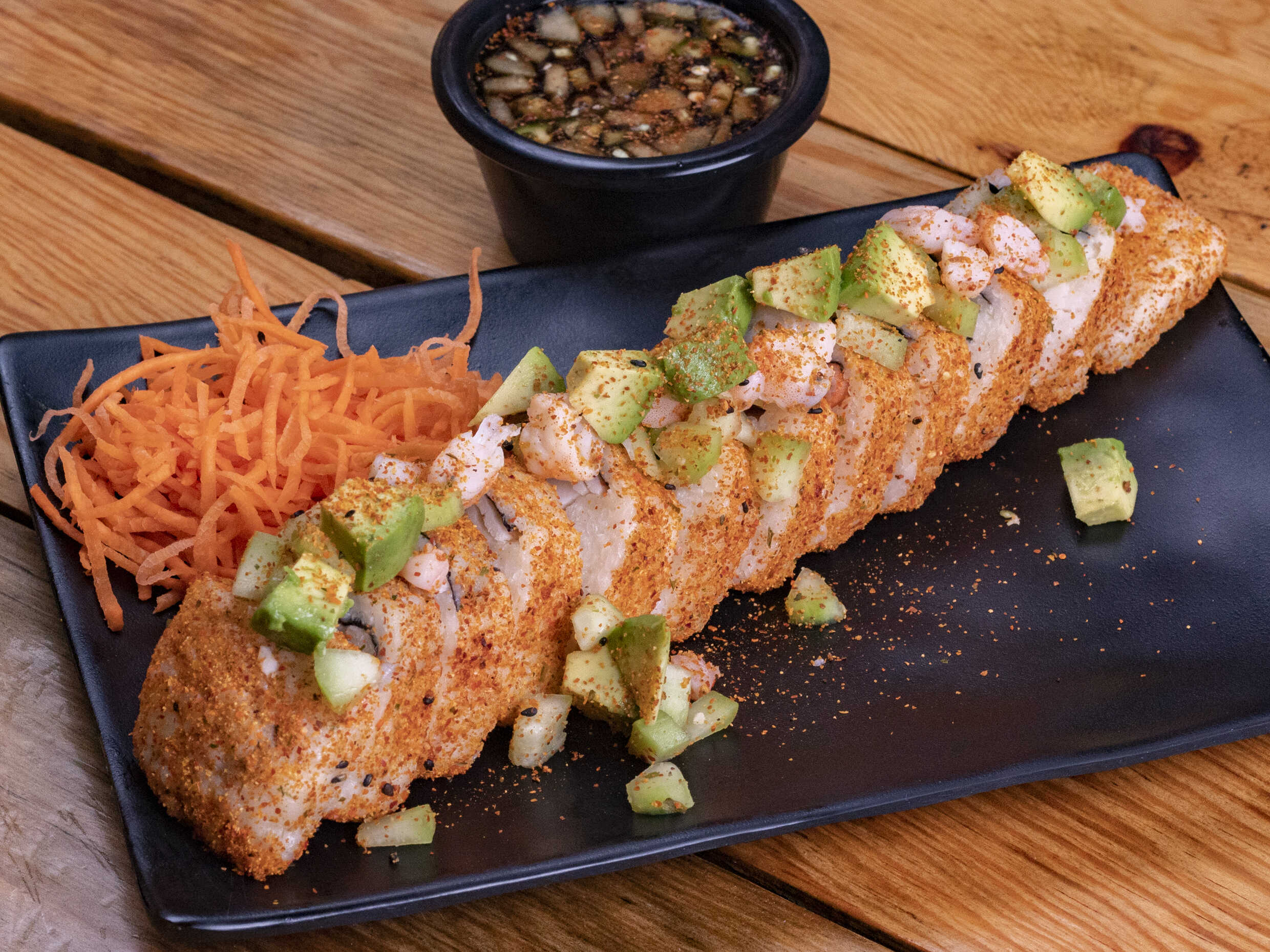 Phila, pepino, aguacate, cangrejo y camarón por dentro. Por fuera mechas de cangrejo, spicy, cebollín, coronado con camarones empanizados, salsa de anguila y ajonjolí.
