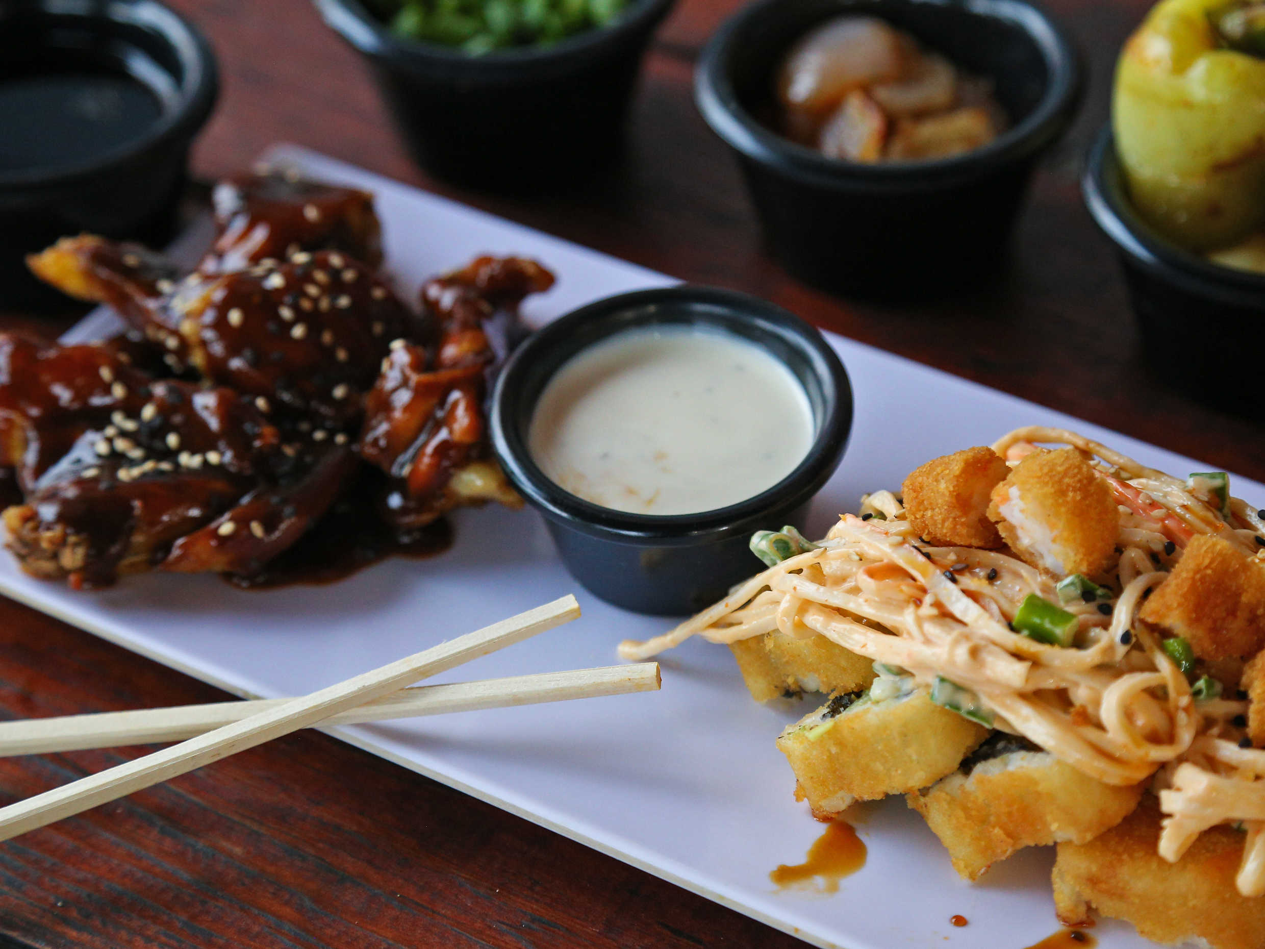Arroz frito con philadelphia, tampico, aguacate, zanahoria, cebollín, res, pollo y camarón.