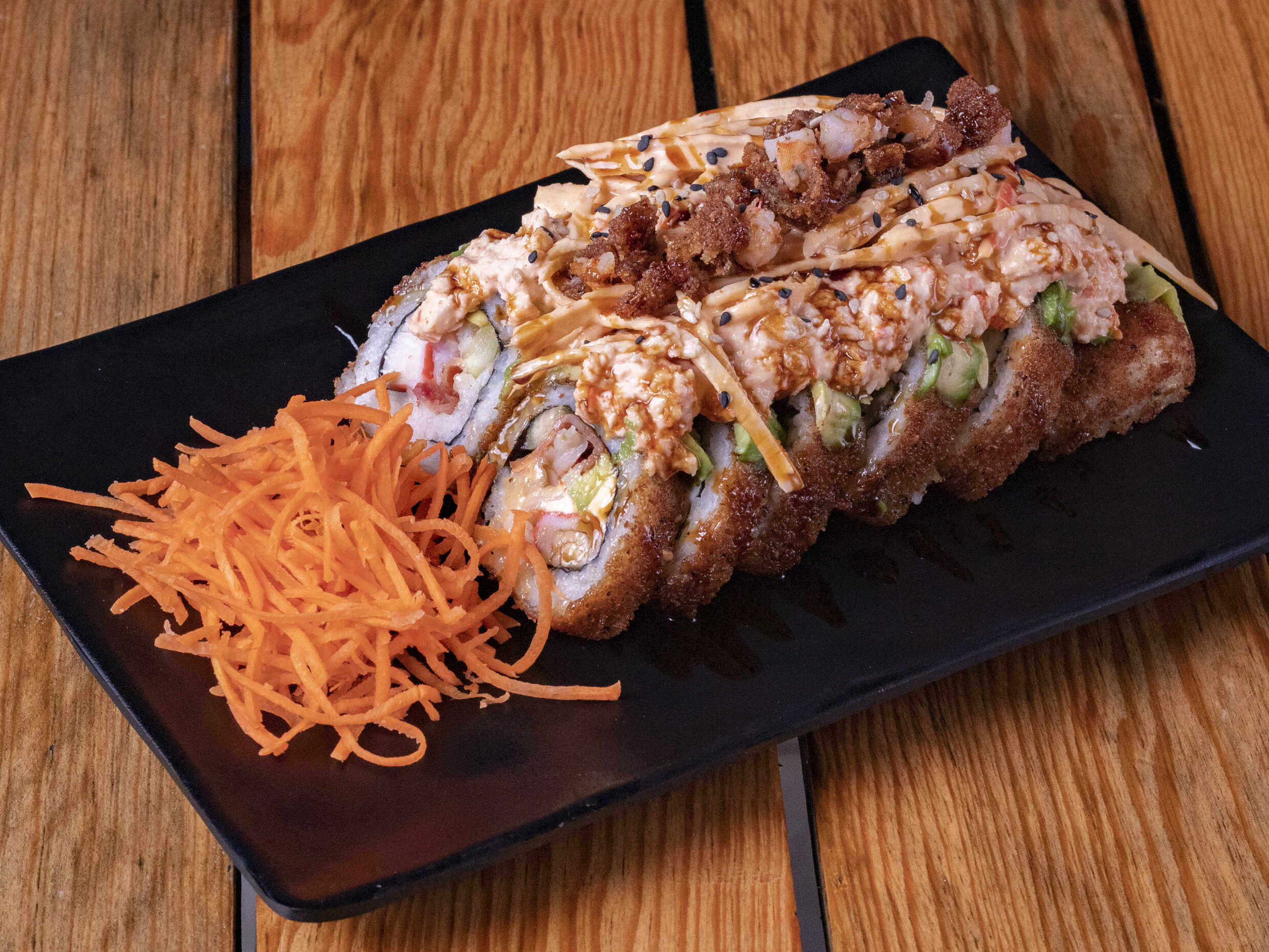 alga, cama de aguacate, phila, pepino y camaron empanizado por fuera topping de tampico spicy, coronado de atun frito con toquen de sriracha anguila y ajonjoli