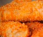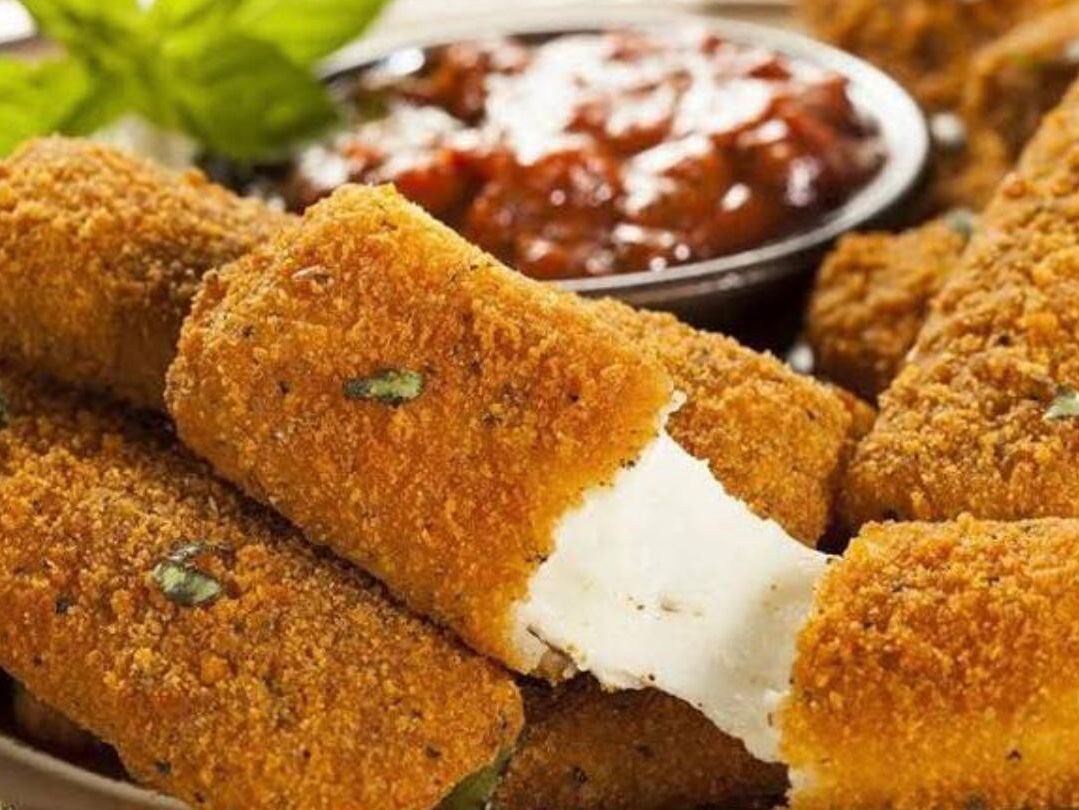 Cuatro dedos de queso empanizados sobre una cama de zanahoria.