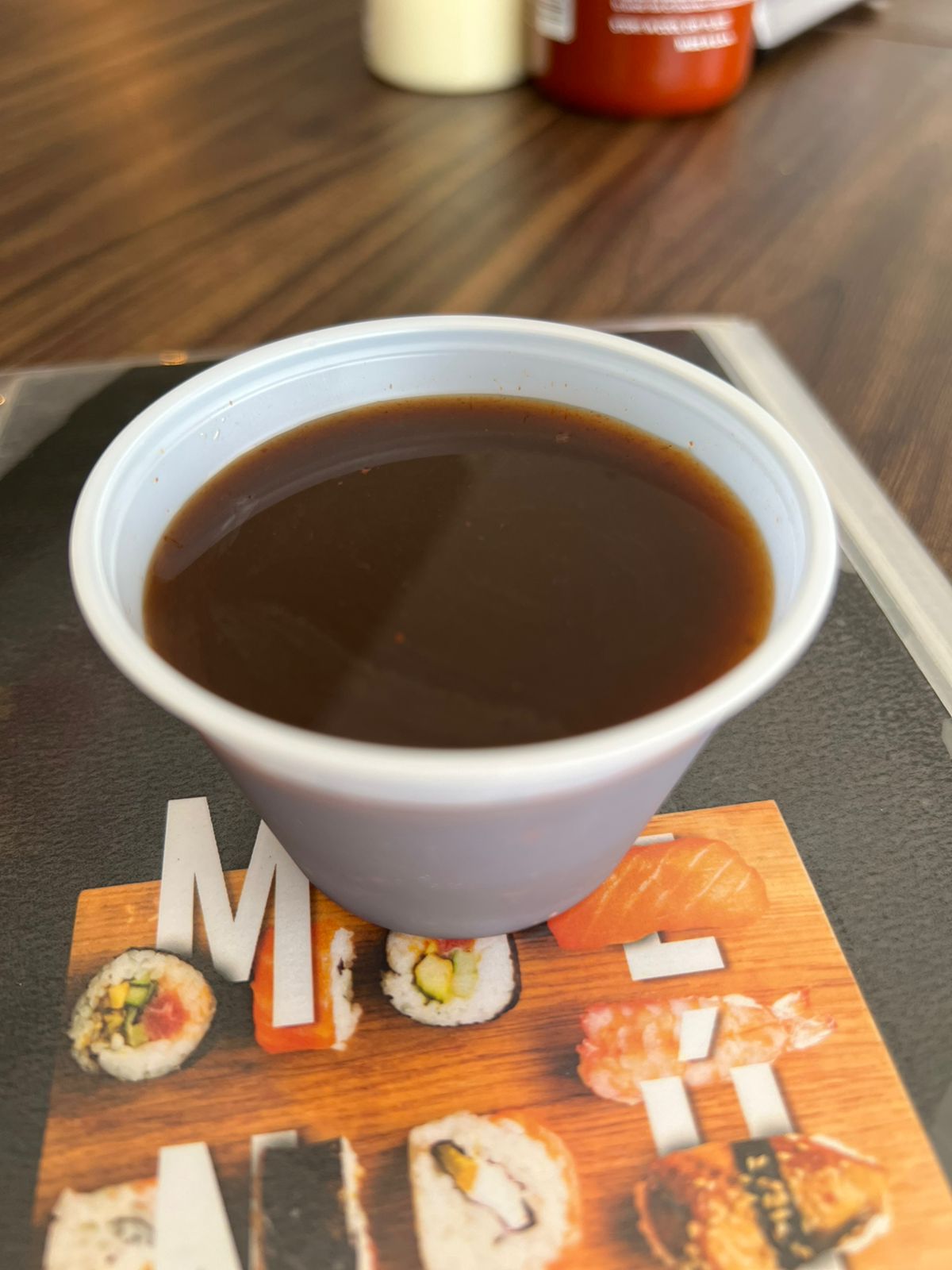 sopa con spicy picosa, camaron, res, huevo, elote, alga, cebollin y naruto