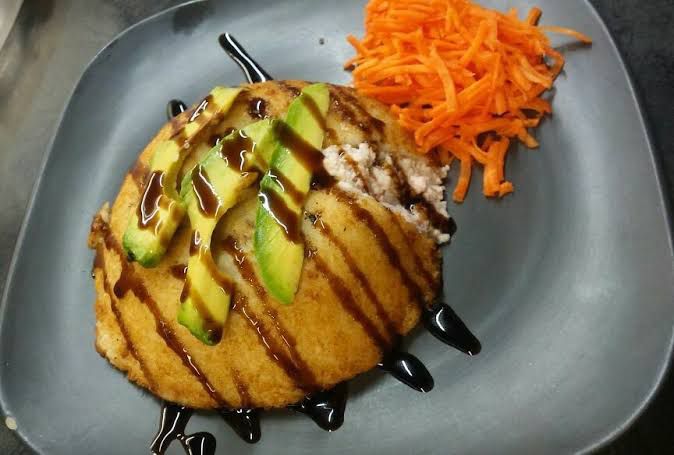Rellena de tampico, camarón, res, pollo, philadelphia, aguacate por encima con un toque de salsa de anguila y ajonjolí.