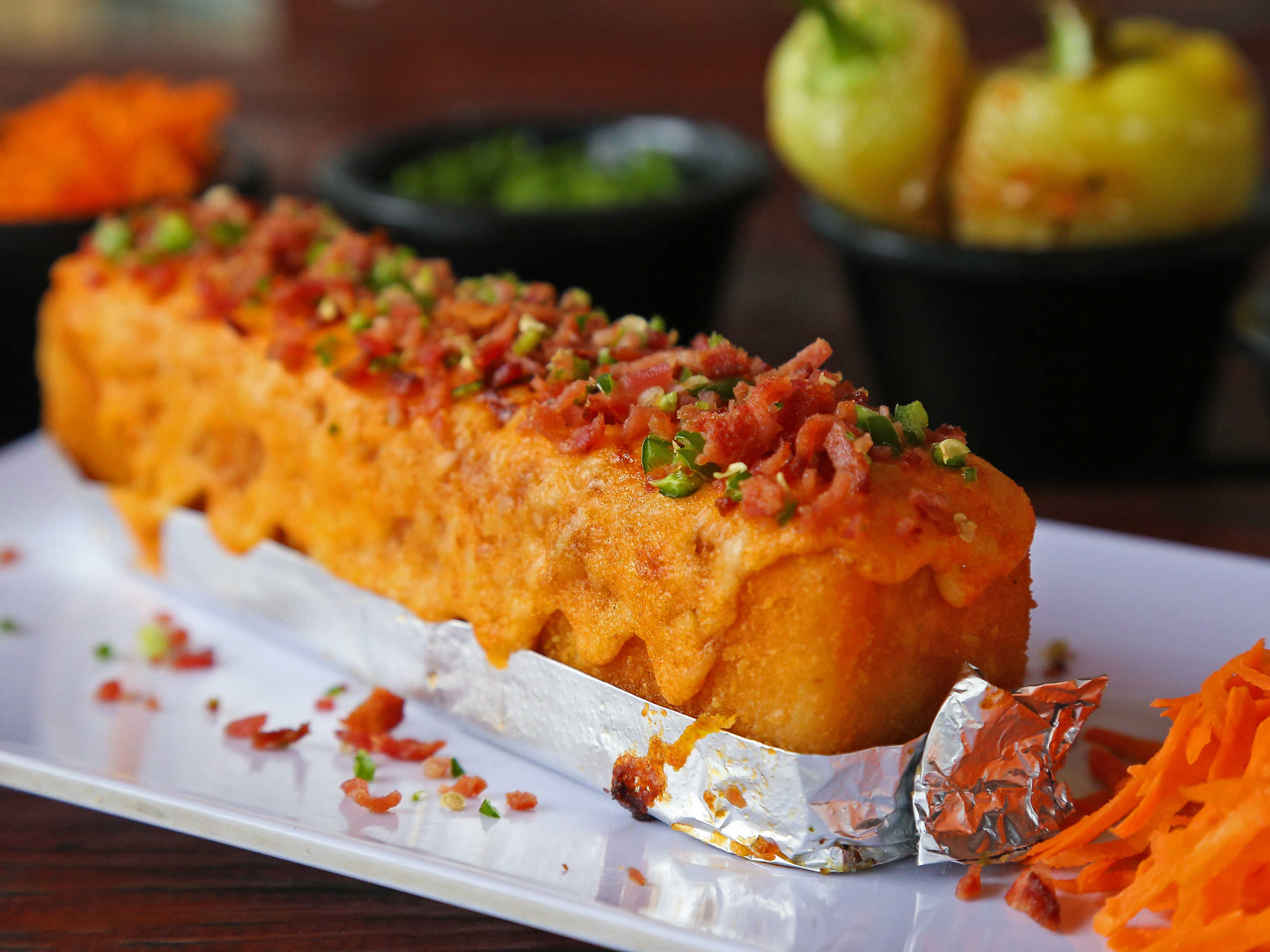 Rellena de tampico, philadelphia, res, pollo, camarón, tocino, serrano por dentro y por fuera gratinado spicy, aguacate, anguila y ajonjolí.