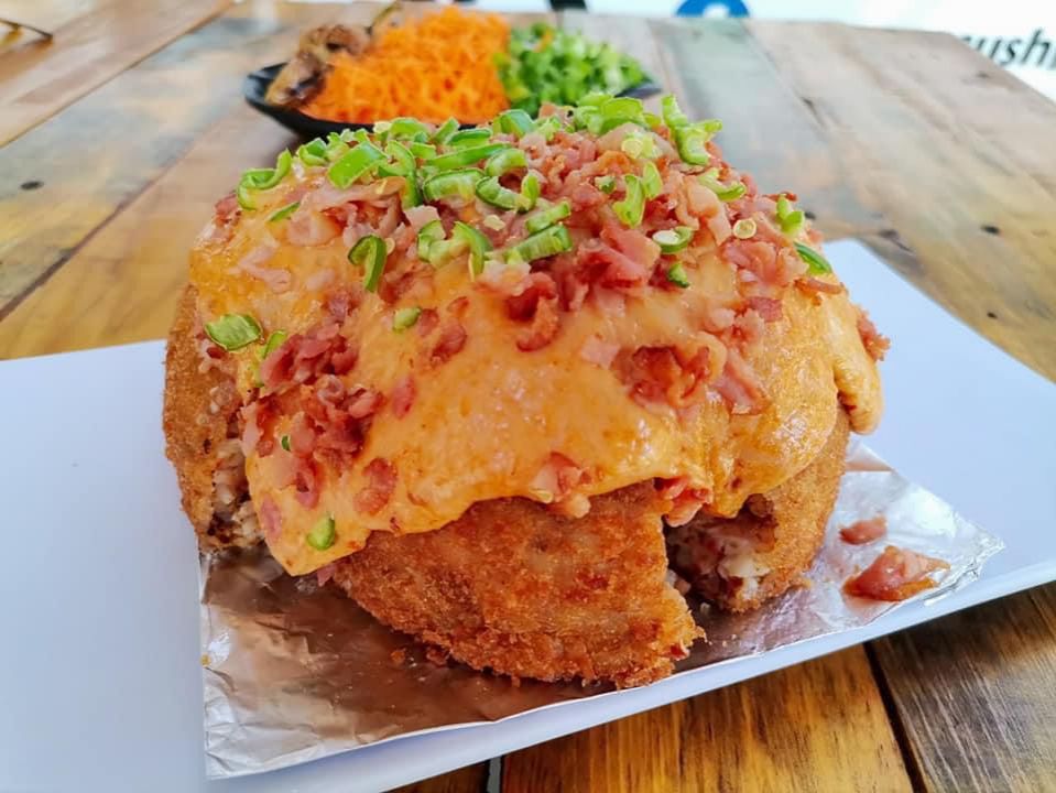 Arroz frito, con cebollín, zanahoria, res, pollo y tocino con tampico spicy. Encima Topping de camarón, queso gratinado, aguacate, anguila y ajonjolí.