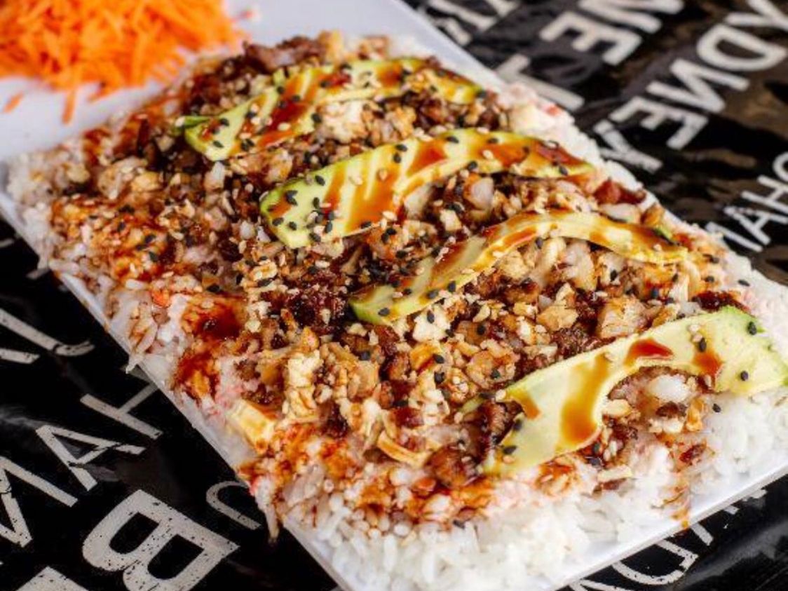 Combinación de arroz blanco con tampico, pollo, res, camarón, philadelphia y por encima aguacate, toque de anguila y ajonjolí.