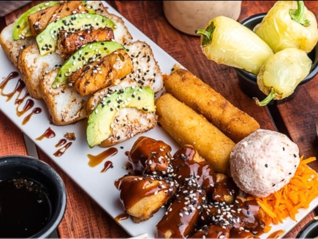 Philadelphia, pepino, aguacate, camarón, cangrejo y tocino por dentro. Por fuera envuelto en aguacate, tampico spicy, mechas de cangrejo spicy con cebollín, camarones empanizados toque shriracha, anguila y ajonjolí.