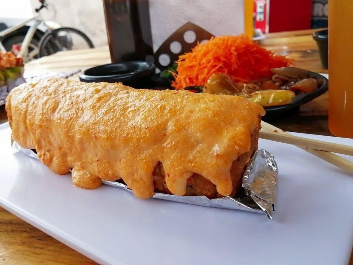 Phila, pepino, aguacate, res y pollo por dentro. Por fuera queso gratinado con trozos de tocino y serrano.
