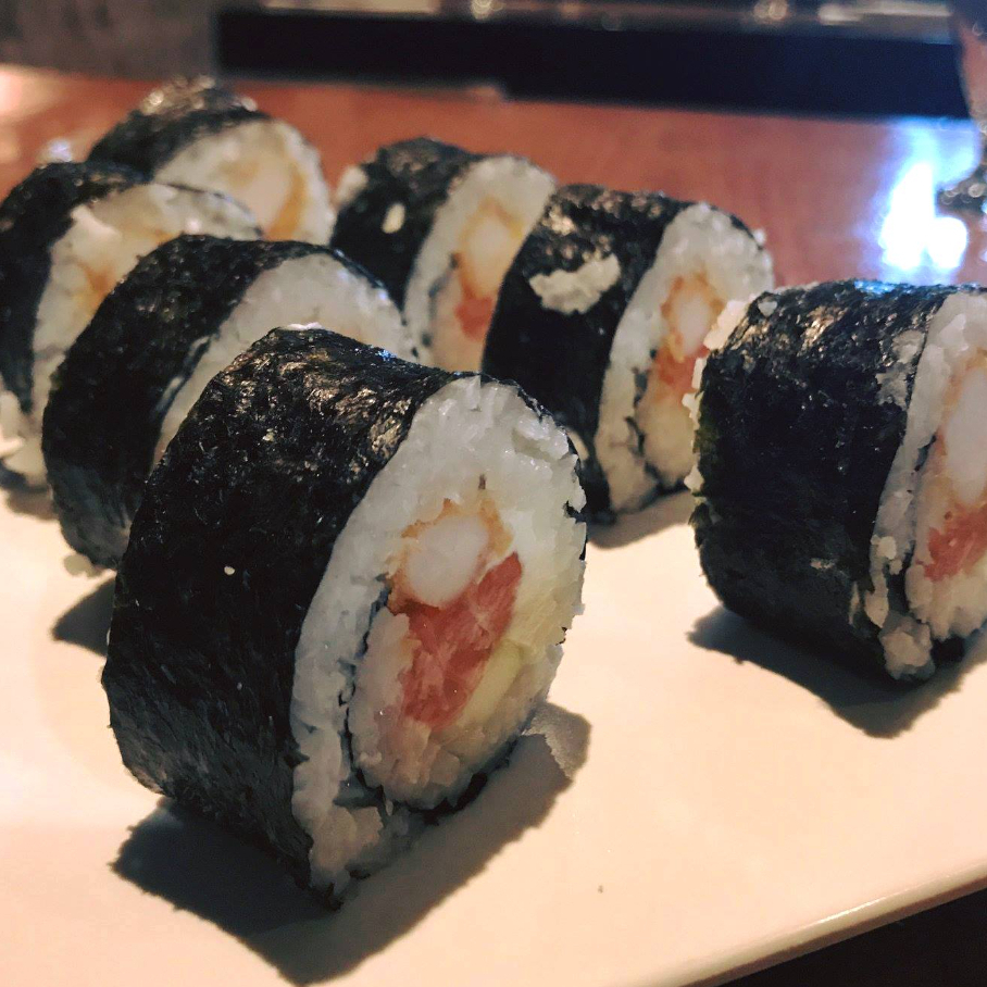 envuelto en alga, por dentro phila, pepino, aguacate, camaron, surimi y atun. coronado de tampico con cebollin, aguacate, sriracha, y ajonjoli