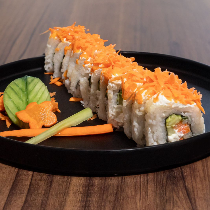 Rollo de arroz philadelphia, pepino, aguacate y zanahoria por dentro. Por fuera philadelphia y zanahoria. De 12 piezas.