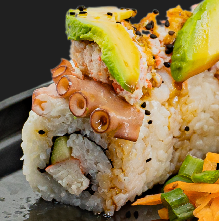 Surimi y pepino por dentro, philadelphia, camarón y pulpo por fuera, tampico, aguacate, anguila y ajonjolí encima.