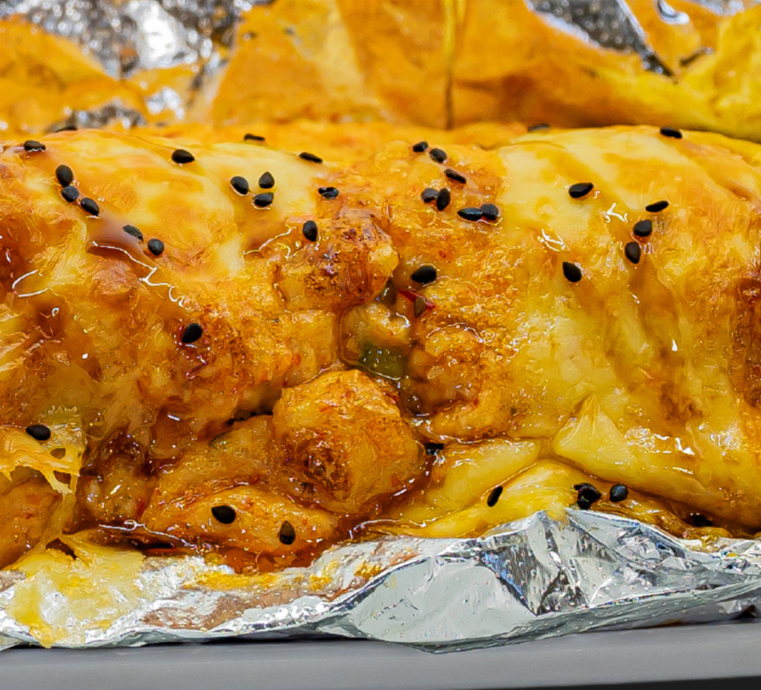 Por dentro: Philadelphia, pollo y res Por fuera: queso gratinado y tocino Encima: tampico