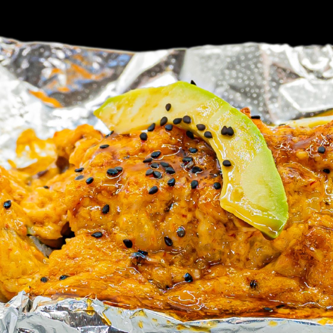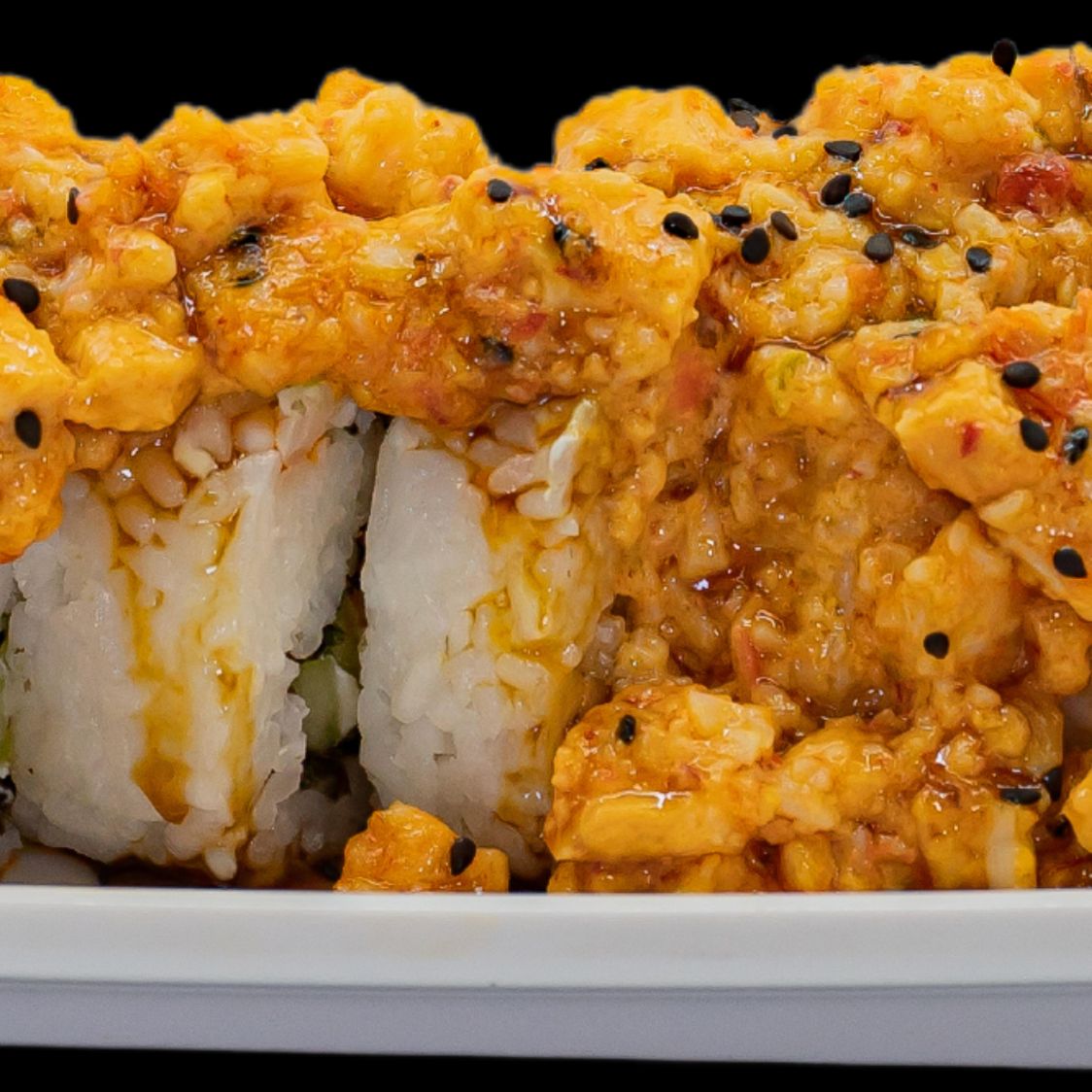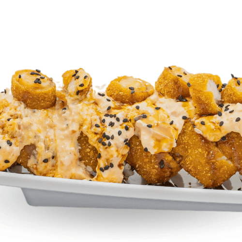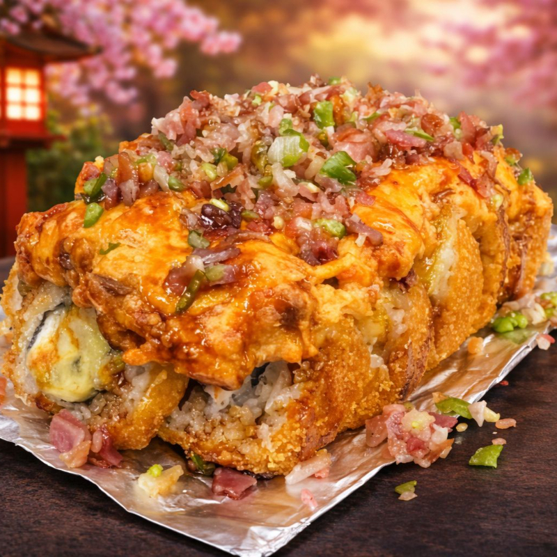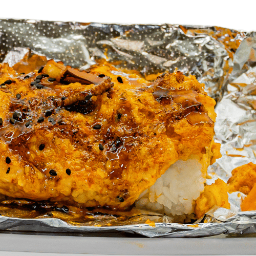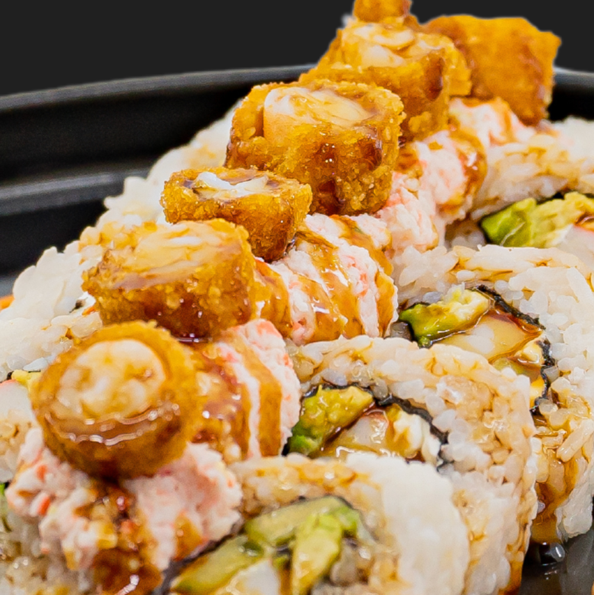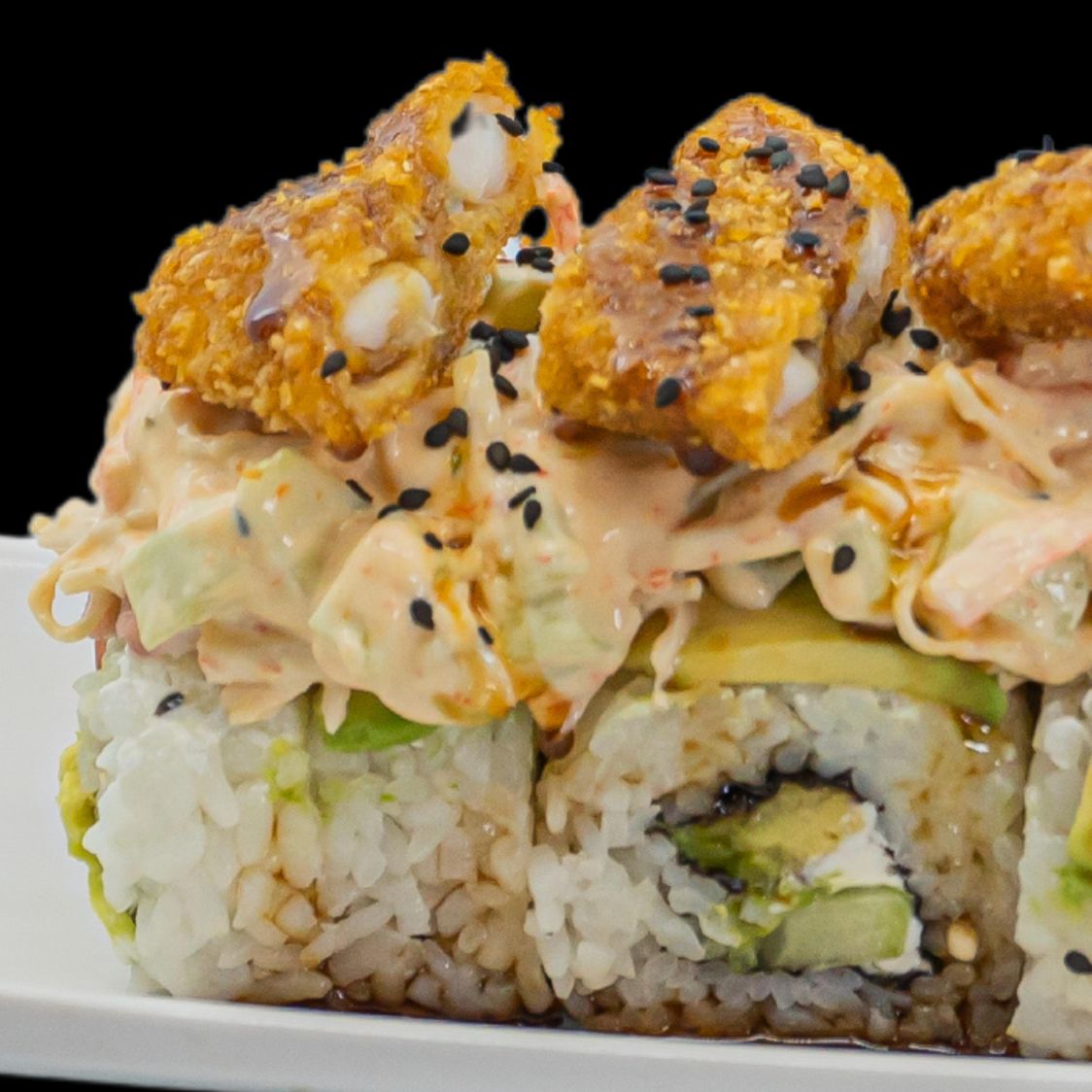 Arroz blanco con spicy, horneado de tampico, tocino, camarones empanizados, aguacate, anguila y ajonjolí.