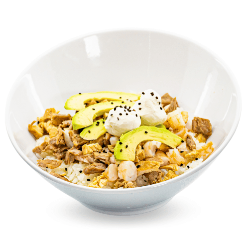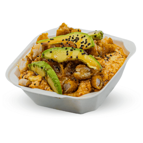 Arroz blanco con tampico, res, pollo, camarón, aguacate, philadelphia y ajonjolí.