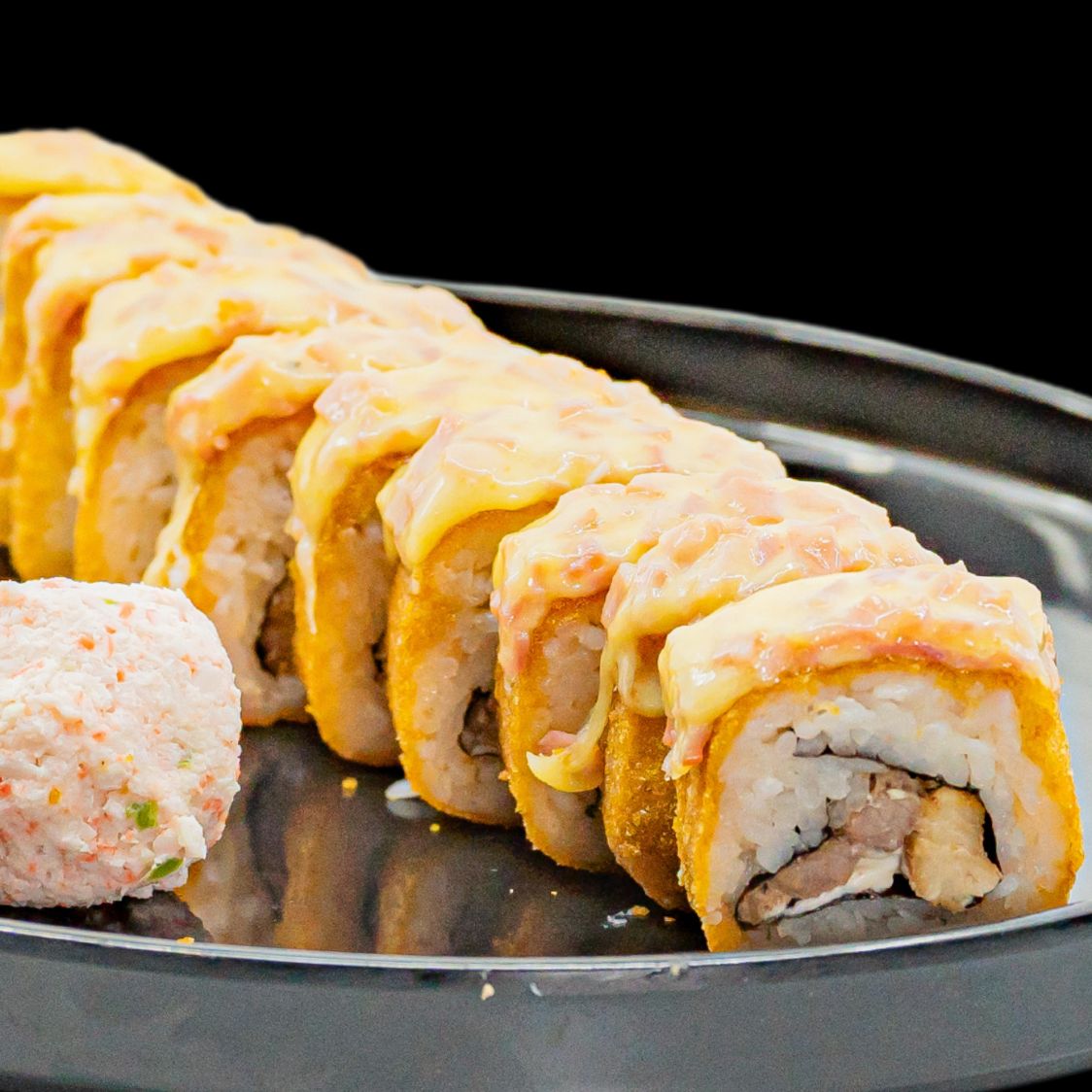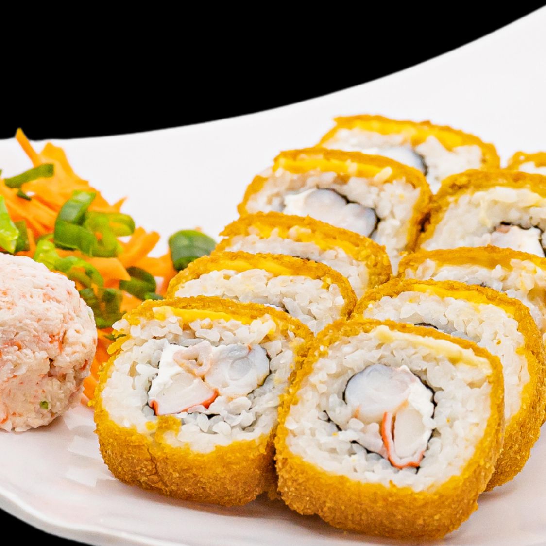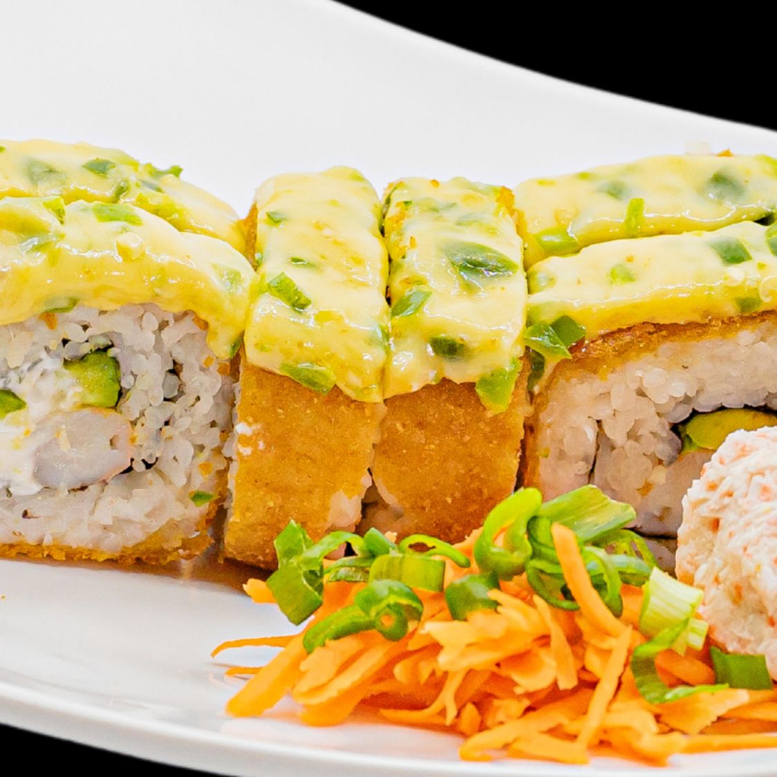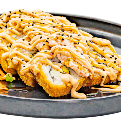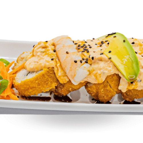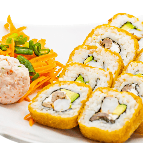 Por dentro: philadelfia, camarón, aguacate y pepino Por fuera: mitad empanizado y mitad natural Encima: Tampico